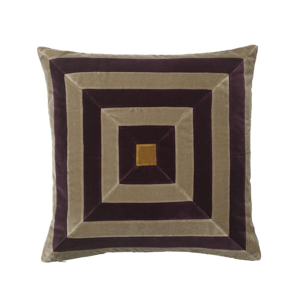 [0] => The Isabel Pillow was designed by Danish artist Christina Lundsteen and features a repeating square pattern in taupe and purple with a gold square anchoring the pattern in the center. Hand made in Denmark, this pillow is made from 100% cotton velvet and has an anti-bacterial down filling. Isabel's contrasting geometric design will bring color and style to any room.