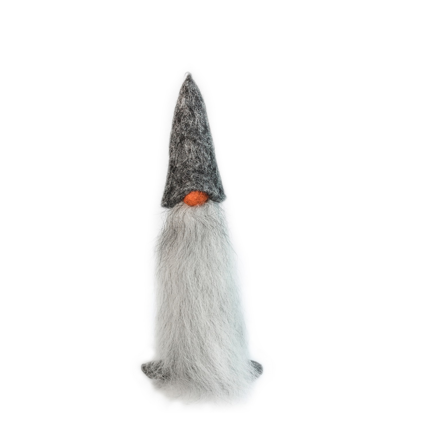 [0] => Handcrafted in Sweden, the Jacob Tomte is available with a grey wool cap and makes the perfect companion for the holidays. A tomte, also known as a "nisse" in Denmark and Norway, is a domestic spirit who helps to ensure the protection and well-being of the household. This tomte has a geniune sheepskin beard with straight hairs, and a wooden frame dressed in frieze. A small orange nose peeking out gives this figurine its cozy and charming personality.