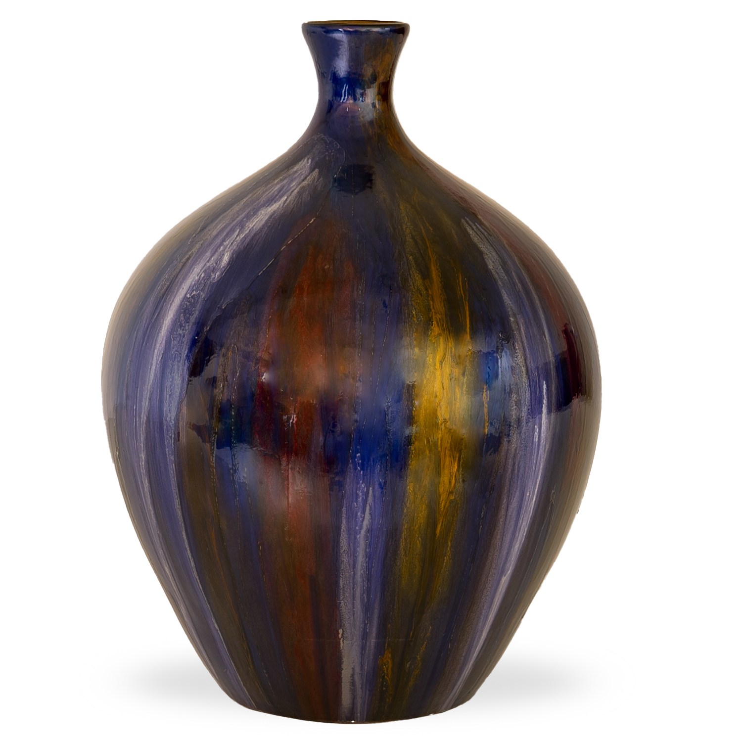 [0] => Made of ceramic with a lacquer topcoat, the Jakarta Vase is painted cobalt blue with bold vertical stripes in red, yellow, and silver. Its distinctive shape features a wide, rounded body tapering to a narrow, flared neck, making this vase a dramatic choice for jazzing up any modern living space.