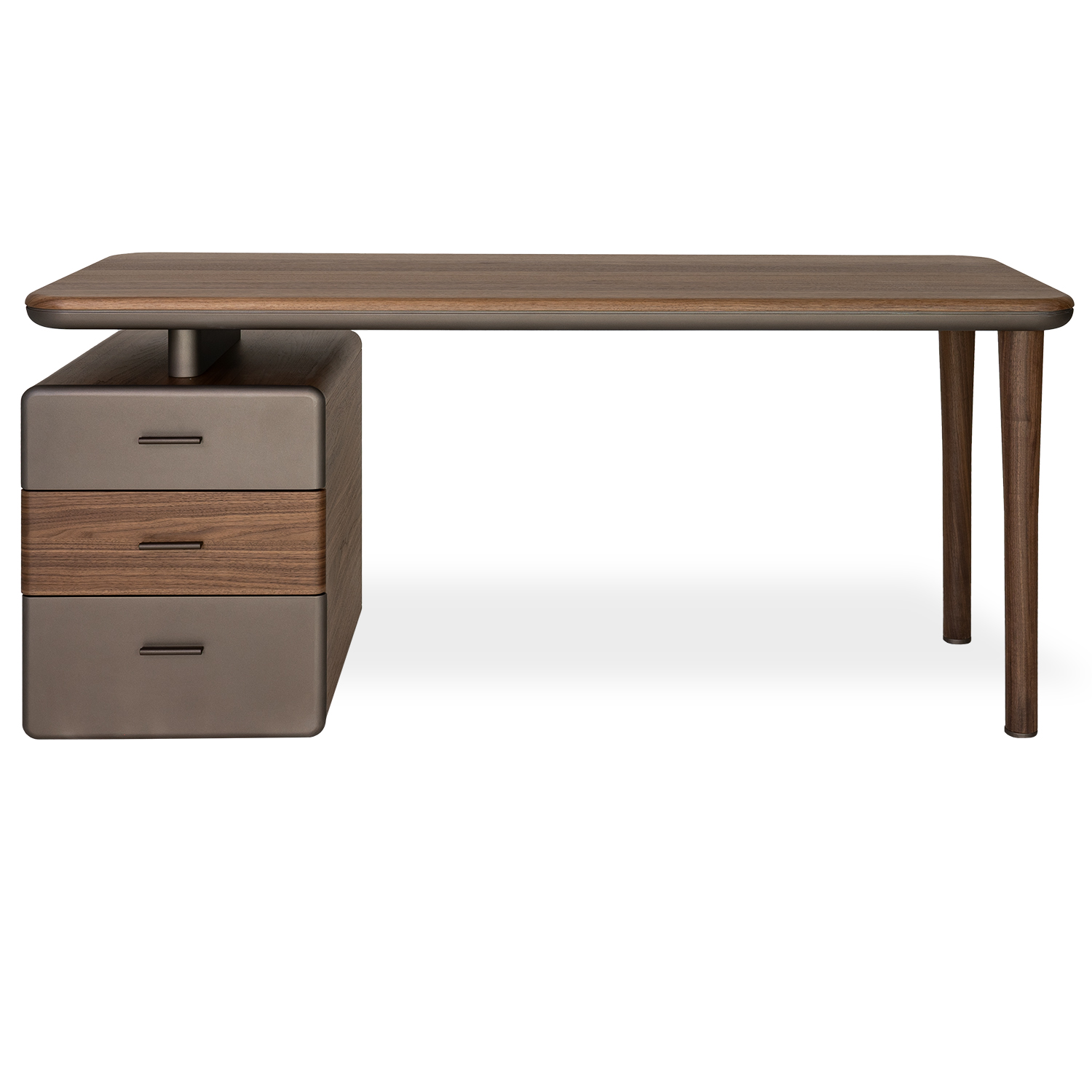 The Jamison Desk effortlessly embodies elegant simplicity and timeless design. Jamison's warm walnut veneer makes it instantly inviting, while the rounded corners and legs heighten its smooth, sleek look. Matte brown lacquered accents add a pleasing contrast to the wood grain, and three soft-close drawers allow for easy organization of papers and supplies. Both classic and modern, the Jamison Desk will add enduring style to any home office.