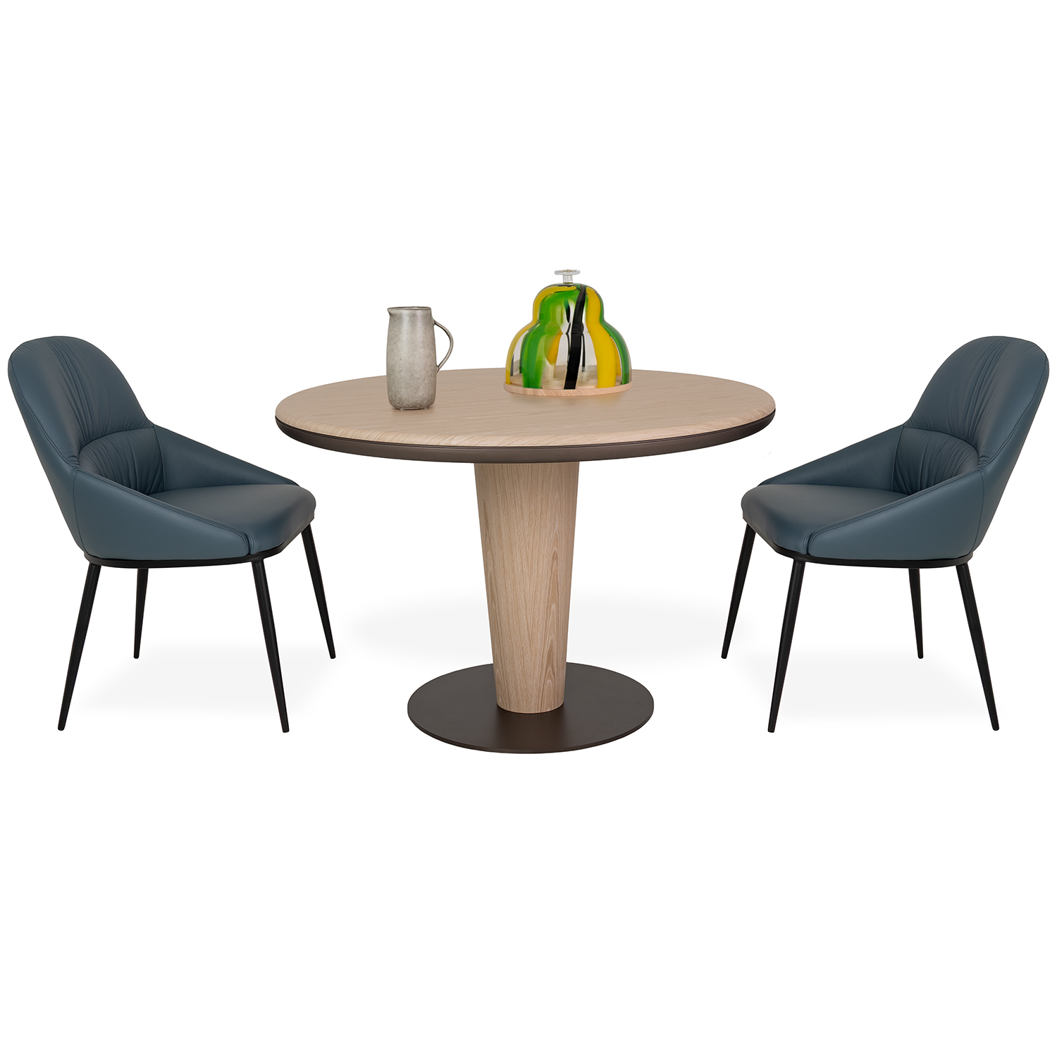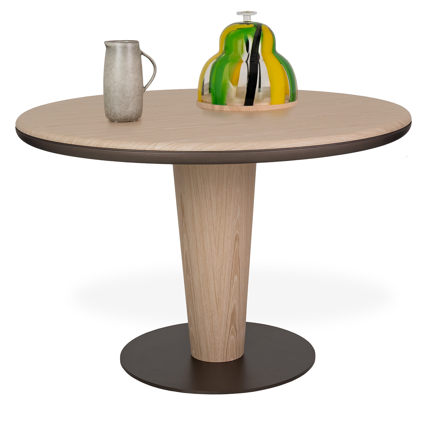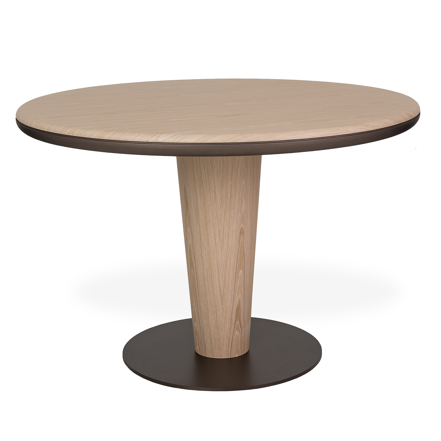 The Jamison 45" Dining Table effortlessly embodies elegant simplicity and timeless design. Jamison's light oak veneer makes it instantly inviting, while a circular tabletop, rounded leg, and matching circular base heighten its smooth, sleek look. The underside of the tabletop and the metal base feature a matte brown lacquer that offers a contrast to the wood grain. Both classic and modern, Jamison will add enduring style to any dining space.