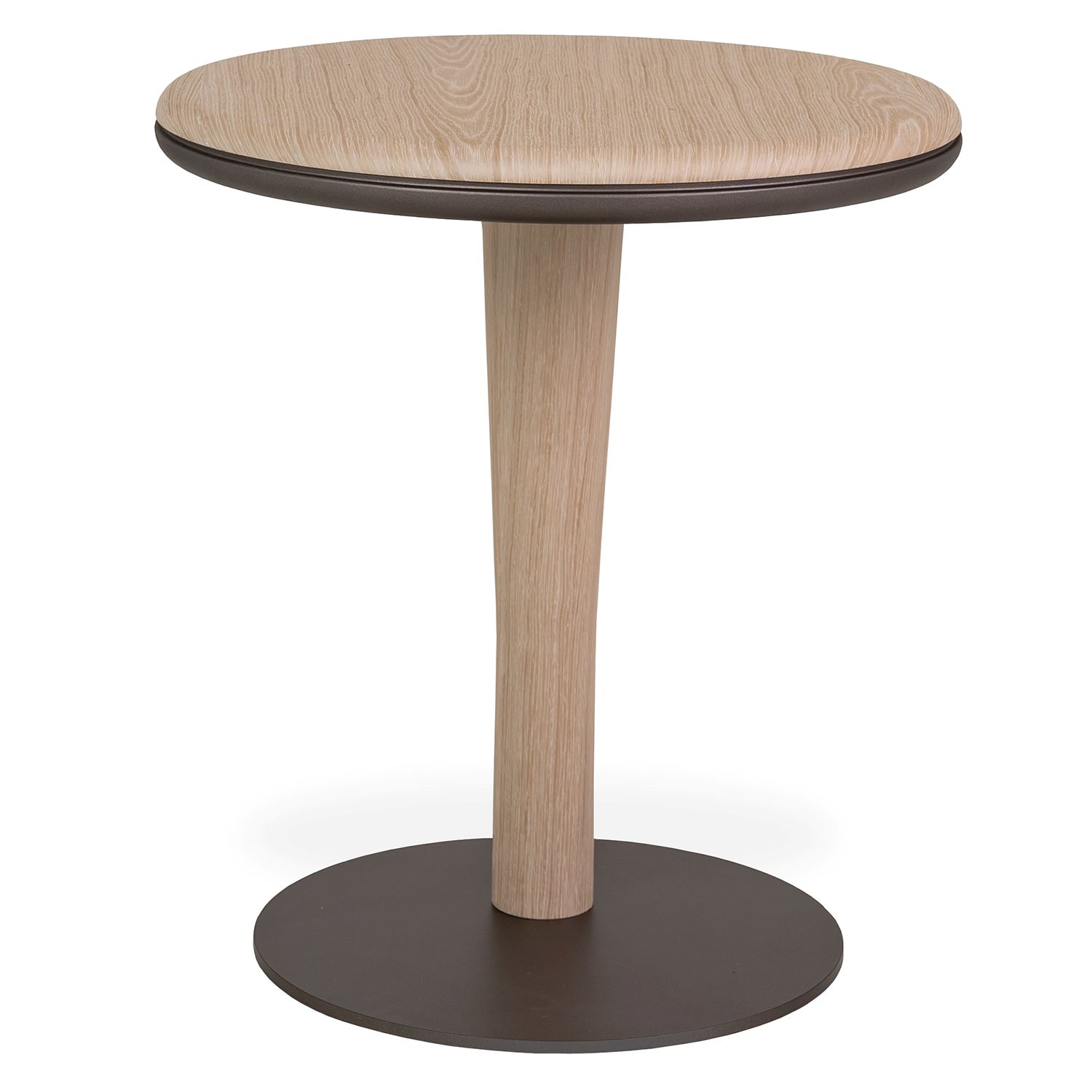 The Jamison Side Table effortlessly embodies elegant simplicity and timeless design. Jamison's light oak veneer makes it instantly inviting, while a circular tabletop, rounded leg, and matching circular base heighten its smooth, sleek look. The underside of the tabletop and the metal base feature a matte brown lacquer that offers a contrast to the wood grain. Pair with the matching Jamison End Table to create a multifunctional setup with a pleasing nested look.