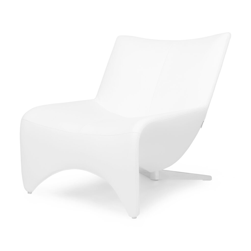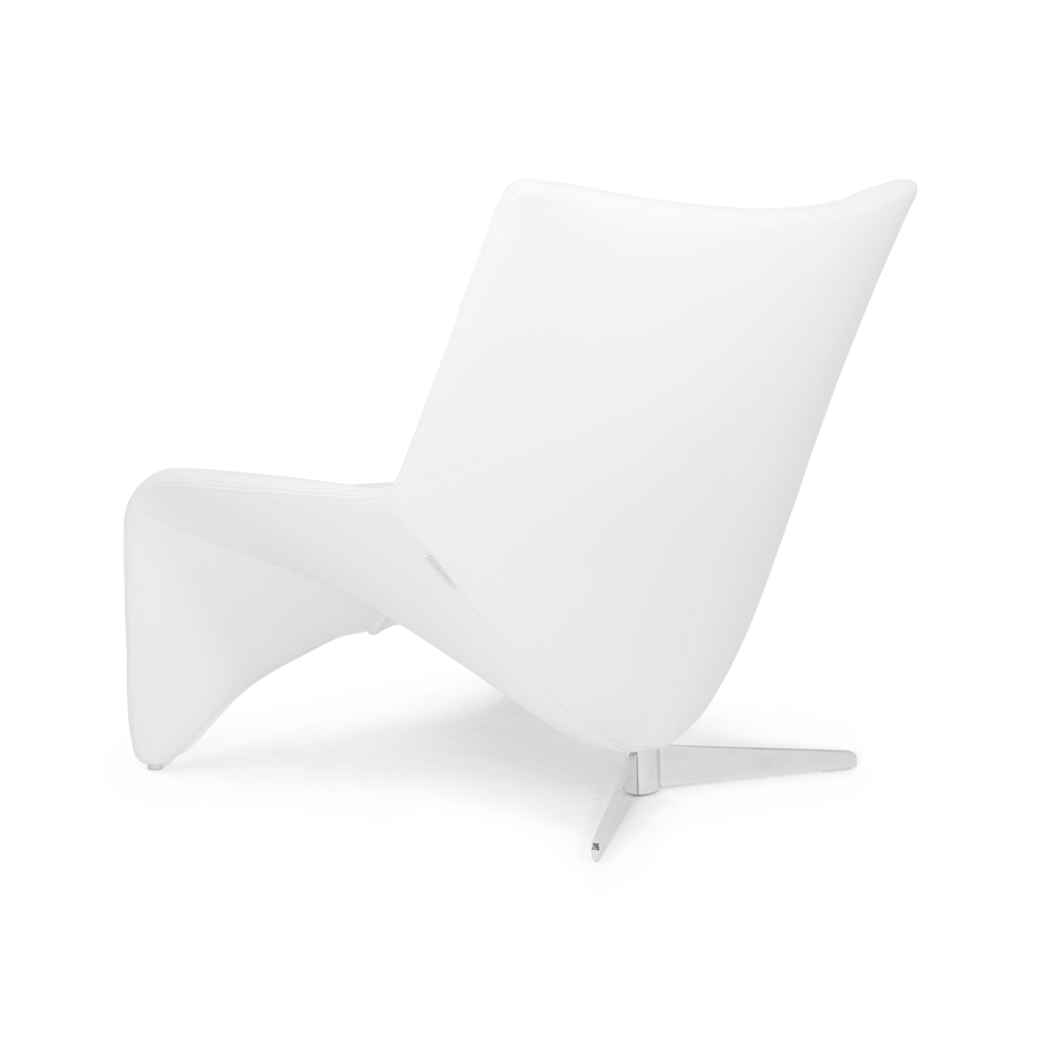 Designed by Jan Armgardt, the Jan Chair has a strikingly modern silhouette that is both casual and sophisticated. The extra-wide seat and angled backrest encourage relaxation, while the organic curves and unique shape of this chair make it a guaranteed conversation piece. Upholstered in white leather with matching stitching, Jan is supported by an angular metal base that provides a sleek accent.