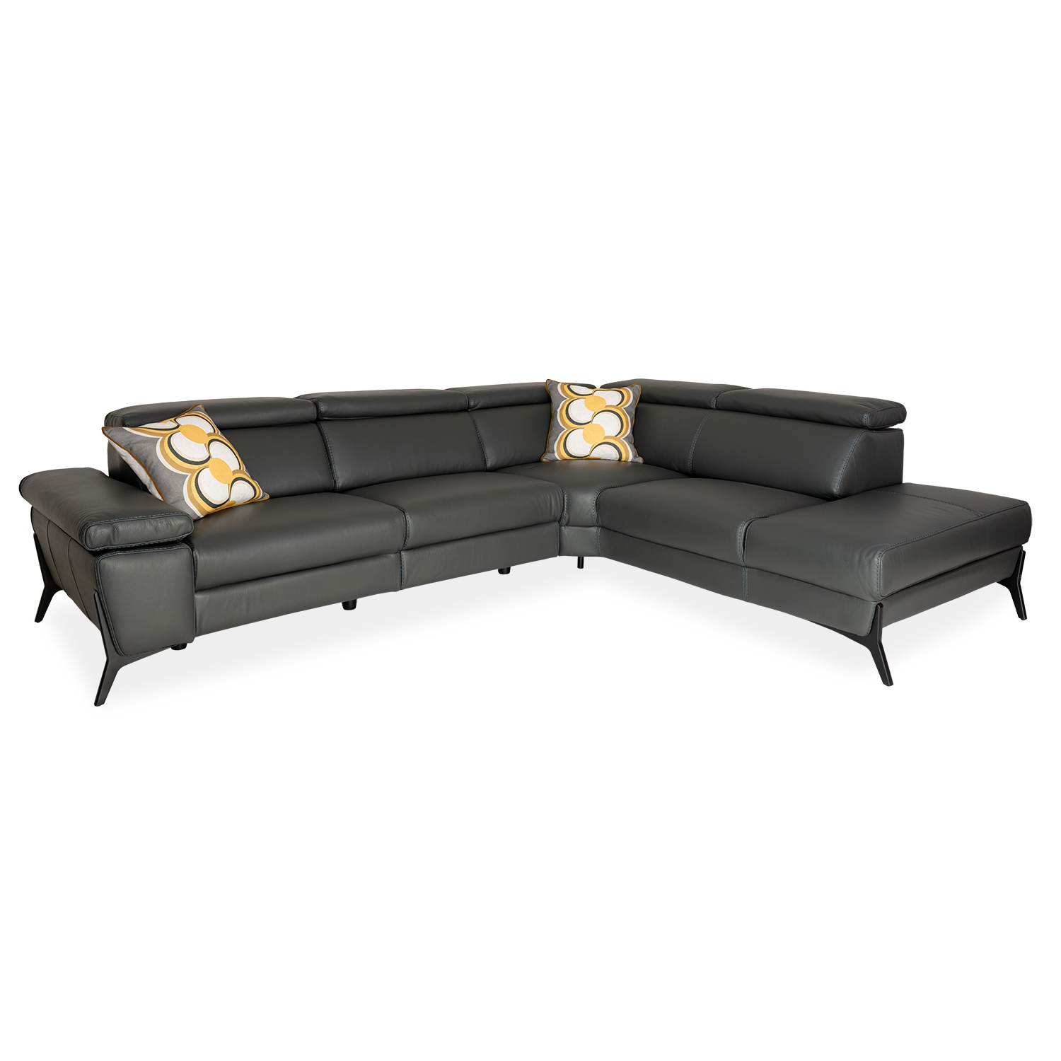 [0] => The Janae Sectional, made in Italy, features steel grey Giotto leather upholstery and matte black metal legs. With wide seats and a terminal chaise, this sectional has an open, inviting design that is sure to bring comfort and relaxation to you and your guests. Power motion buttons tucked discreetly between the cushions allow you to extend the legrest and headrest on two of the seats, while the remaining three headrests are manually adjustable for all-around customized comfort.