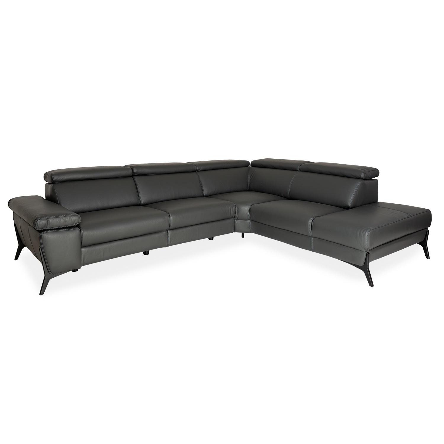The Janae Sectional, made in Italy, features steel grey Giotto leather upholstery and matte black metal legs. With wide seats and a terminal chaise, this sectional has an open, inviting design that is sure to bring comfort and relaxation to you and your guests. Power motion buttons tucked discreetly between the cushions allow you to extend the legrest and headrest on two of the seats, while the remaining three headrests are manually adjustable for all-around customized comfort.