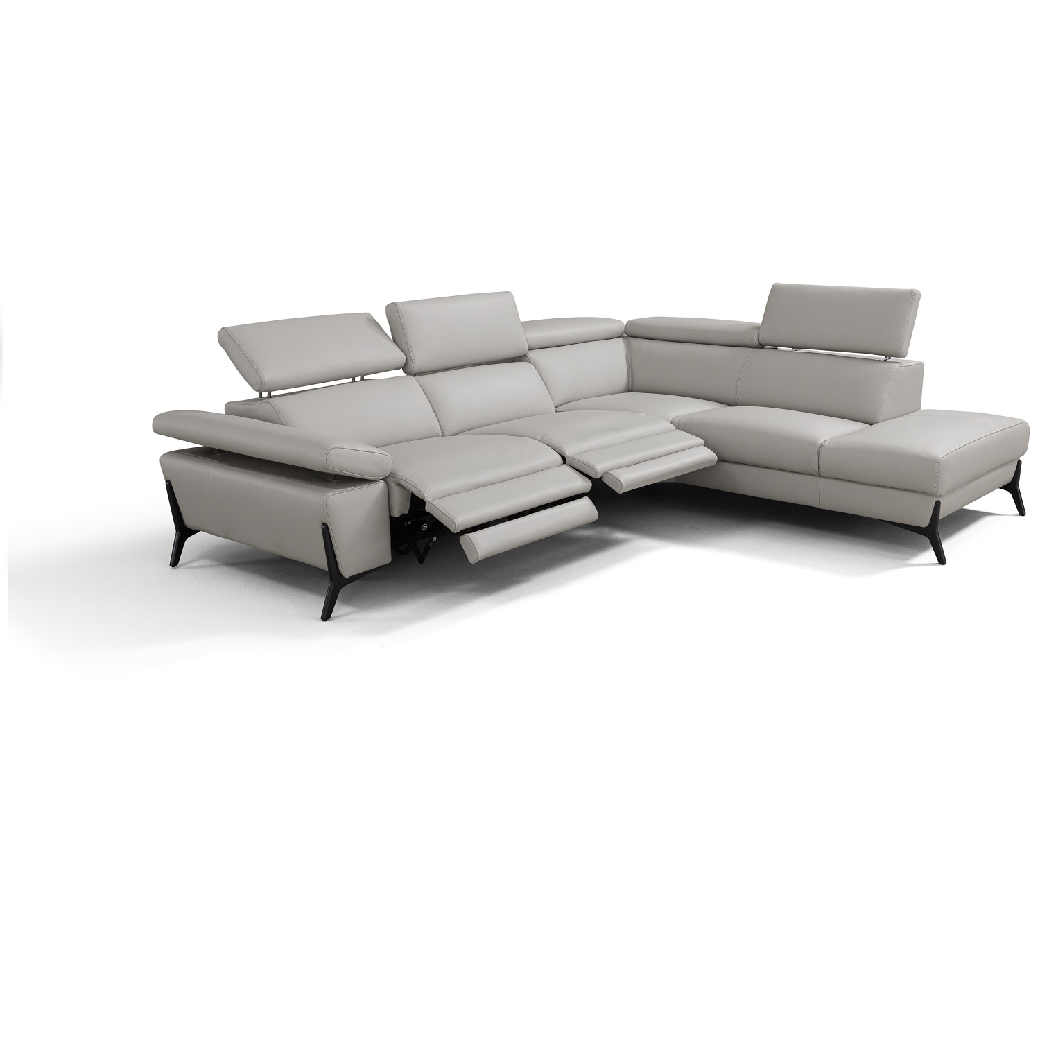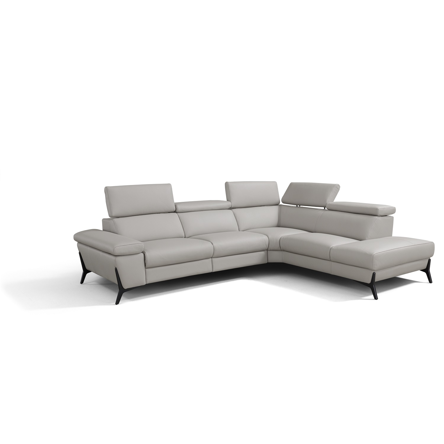 The Janae Sectional, made in Italy, features top-grain light taupe leather upholstery and matte black metal legs. With a left-facing chaise and wide seats, this sectional has an open, inviting design that is sure to bring comfort and relaxation to you and your guests. Manually-adjustable headrests customize your comfort while the triangular legs add a sculptural touch.