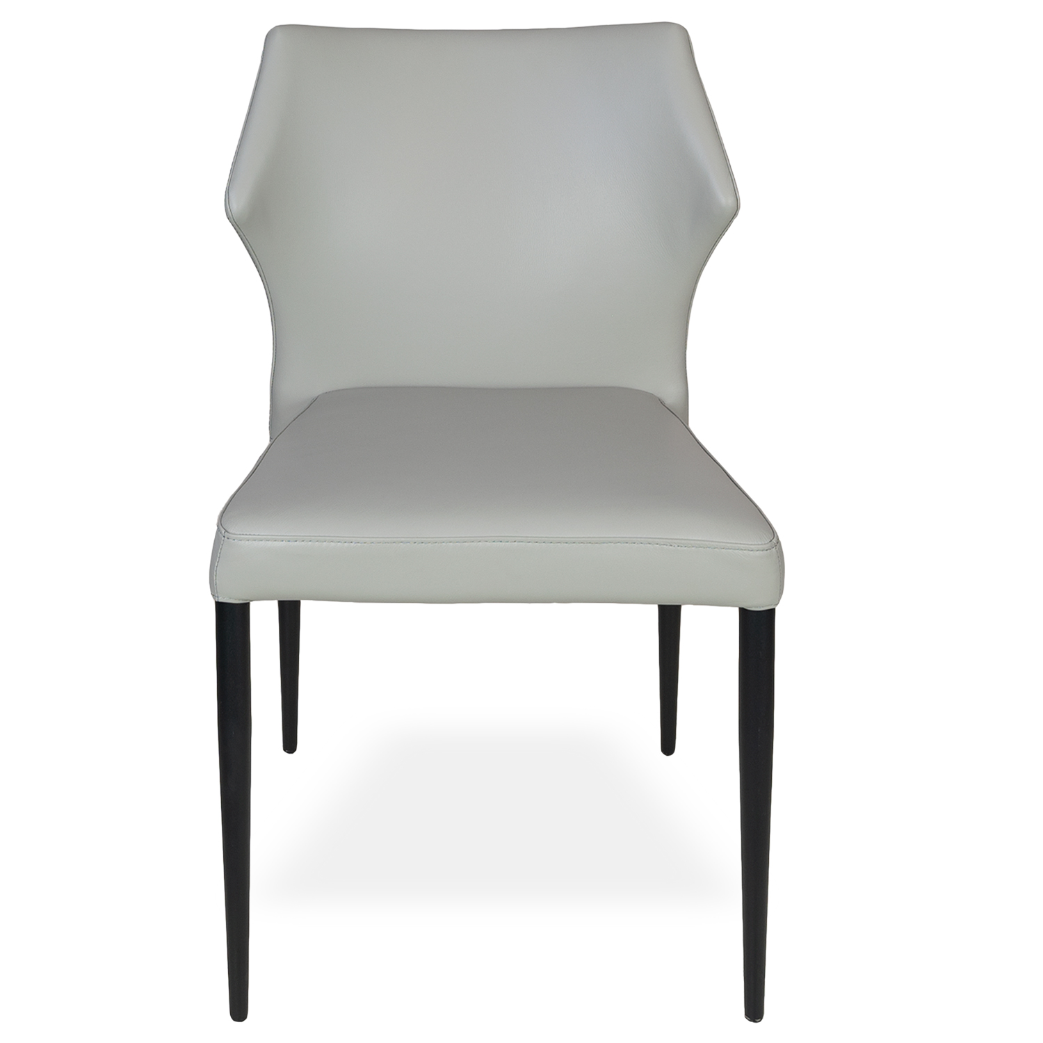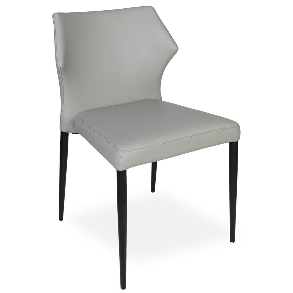 The Jason Dining Chair features a uniquely modern silhouette with a curved hexagonal backrest and slim tapered legs. Jason is upholstered in pewter top-grain Italian leather for a luxurious feel, with black legs made of powder-coated metal. A thoughtfully designed shape lets Jason be stacked with others of its kind, resulting in a chair that's both space-savvy and elegant.
