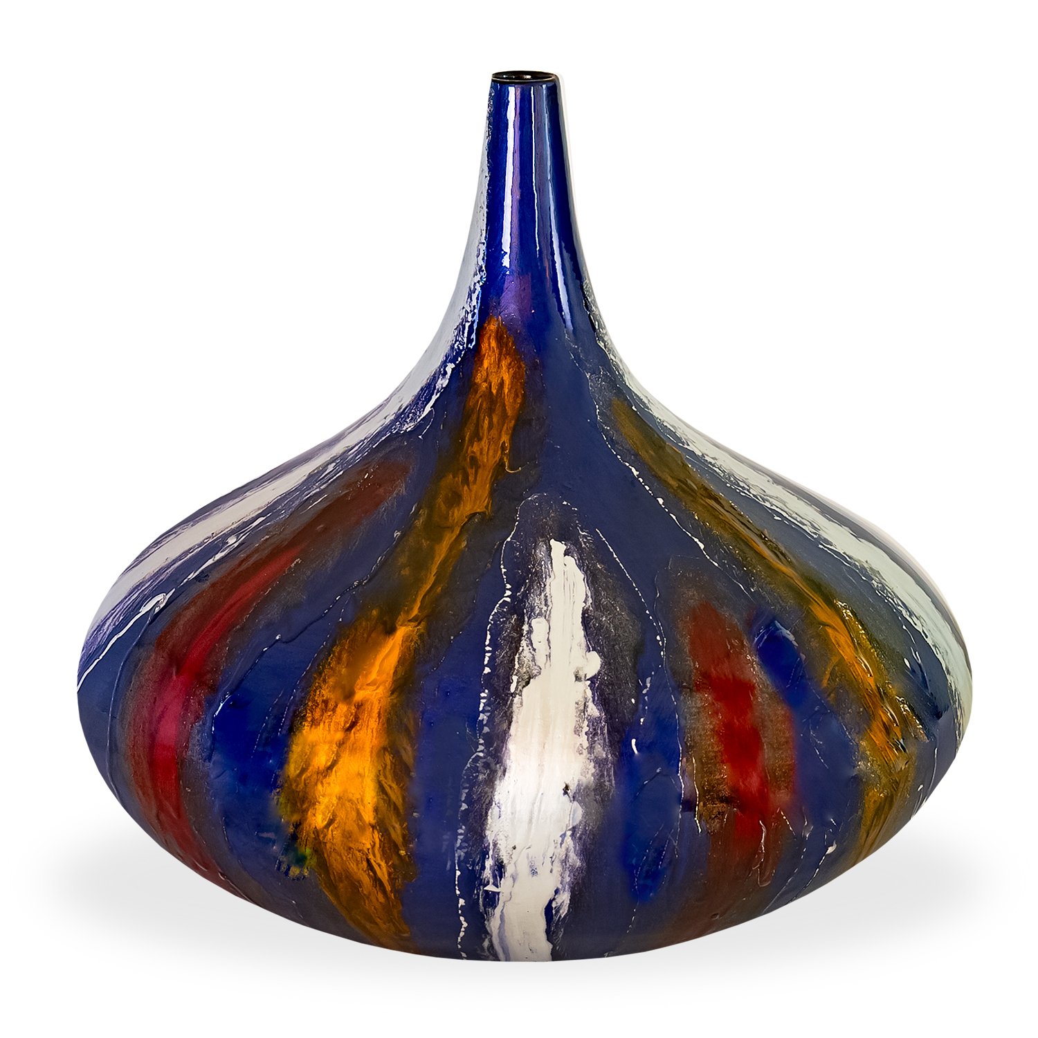 [0] => Made of ceramic with a lacquer topcoat, the Java Vase is painted cobalt blue with bold vertical stripes in red, yellow, and silver. Its unique onion shape features a wide, short base tapering to a narrow neck, making this vase a dramatic choice for jazzing up any modern living space.