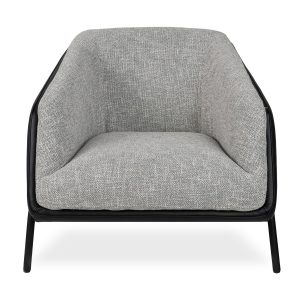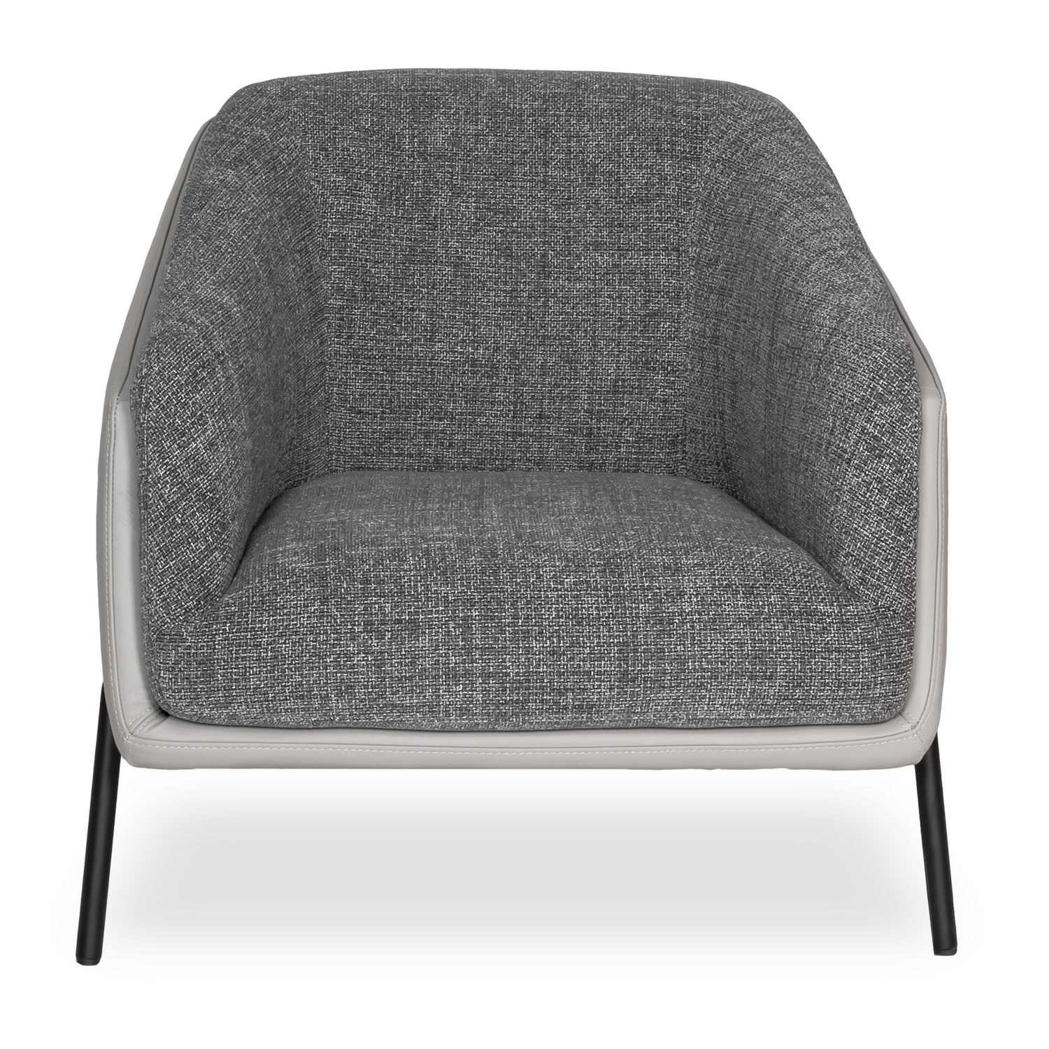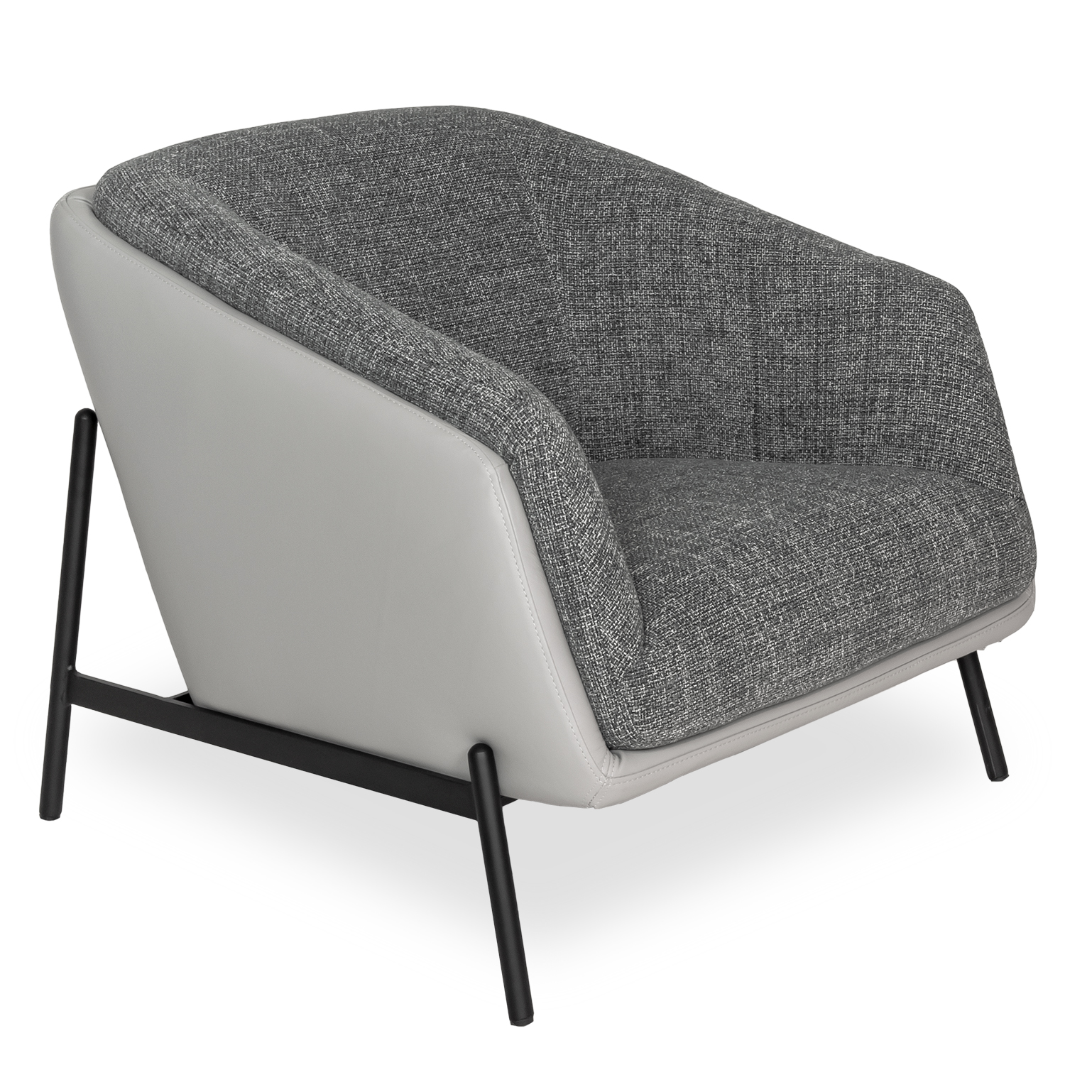 The Jaxon Chair is both cozy and cosmopolitan, with its striking nested design and angled silhouette. The "inner" seat is upholstered in polyester gunmetal fabric woven from a mix of gray, black, and white threads, while the "outer" seat is upholstered in grey protected leather. The sloping armrests and back, as well as the black metal base that forms an open outline behind the seat, make the Jaxon a premier choice for enthusiasts of contemporary furniture.