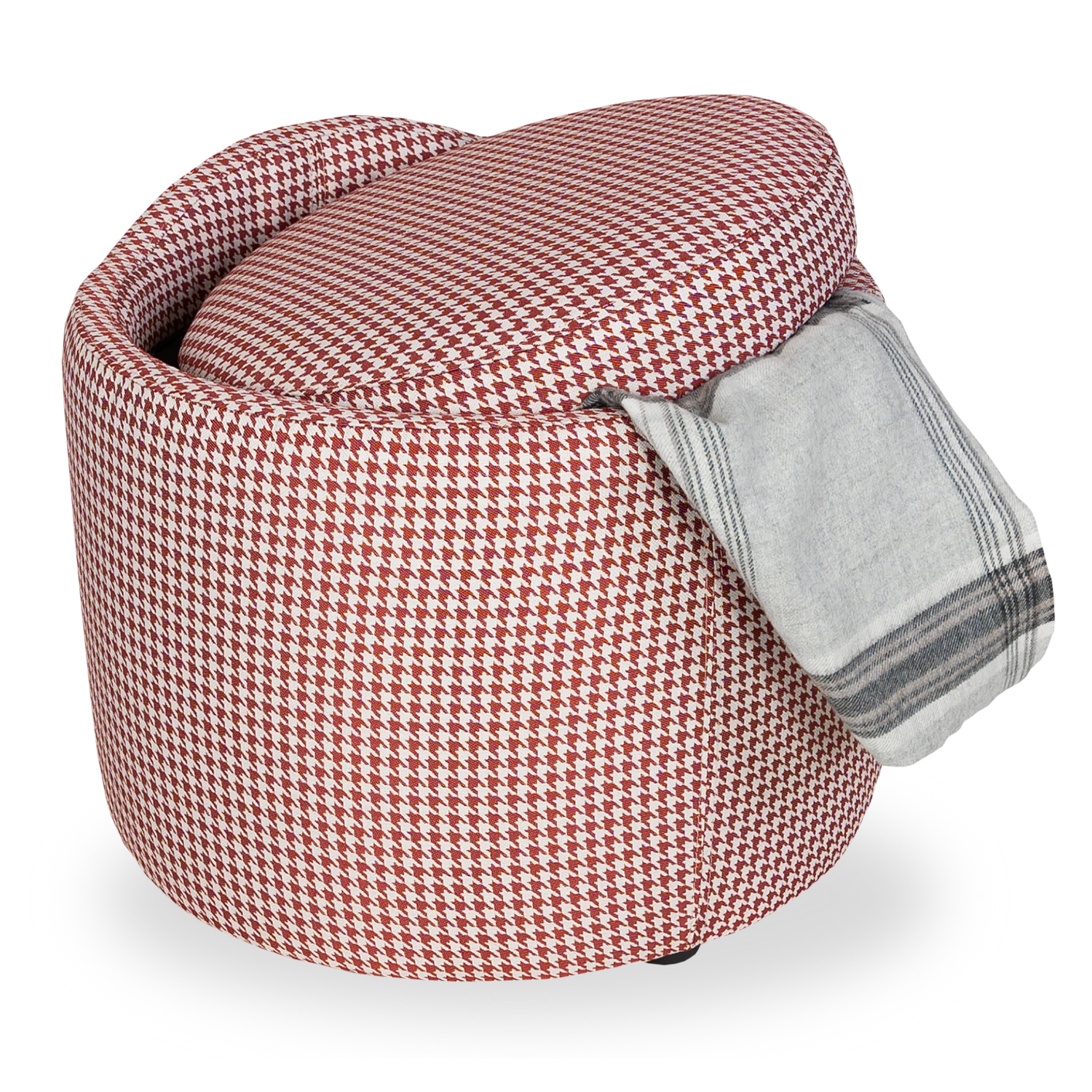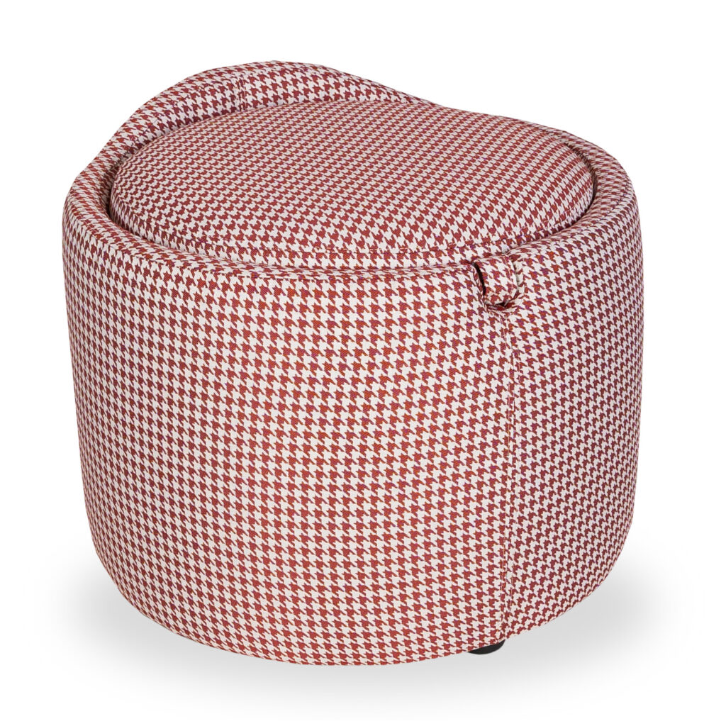 [0] => Both stylish and functional, the Jazz Ottoman features a handy storage compartment, fabric upholstery in a red and white houndstooth pattern, and a unique silhouette with an asymmetrical, slightly raised top edge. Jazz comes with a convenient loop on its cushion that fits into a corresponding divot, letting you easily lift the top off to access the storage space underneath. Whether you use this ottoman for sitting, resting your feet, or stashing living room extras, Jazz can handle it all -- and look great doing it.