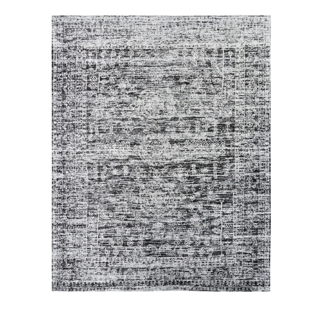 The Jenna rug is contemporary with variegated tones of dark and light greys. Jenna is handcrafted with cotton chenille yarns against a natural cotton backing in a Lori-Loom weave.