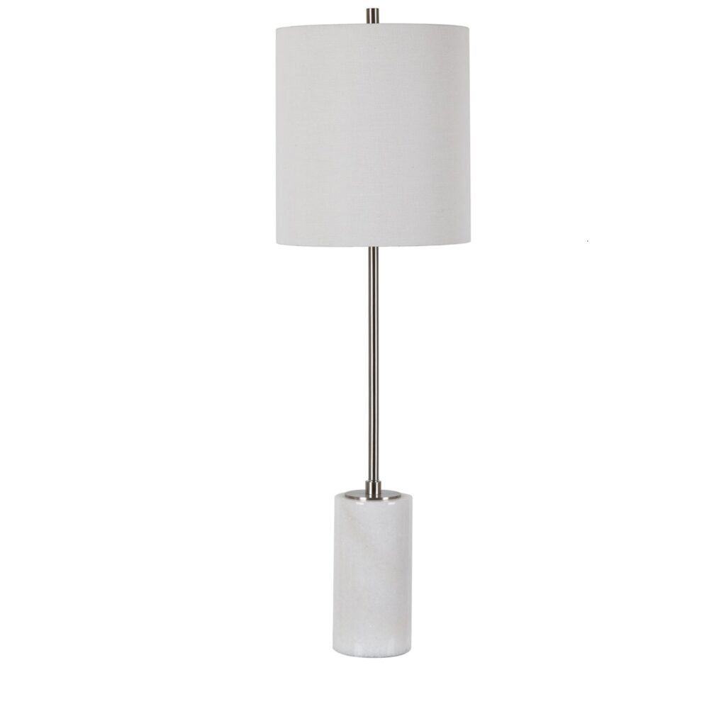 [0] => The Jenna Table Lamp features a white marble base with a chrome finish and white linen shade. The cylindrical shade and base complement each other, as well as the thin chrome pole. A universally flattering lamp that you can incorporate into any design environment.