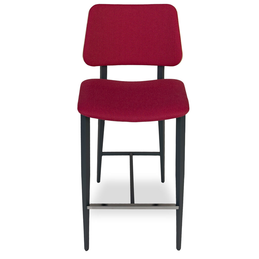 Designed in Italy, the Joe Counter Stool features a chic blend of wood, fabric, and metal, as well as a gently curved seat and backrest for added comfort. The red fabric upholstery of the seat accentuates the warmth of the walnut-veneered wood, while the horizontal texture of the wood grain contrasts with the sleek, tapered legs made of graphite metal. Eclectic yet minimalist, the Joe Counter Stool is ready to seat you in style.