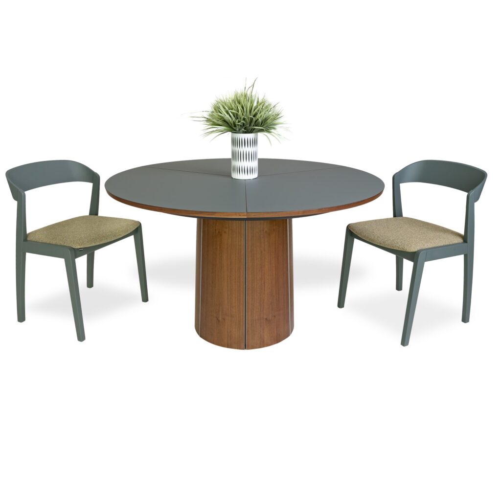 The Jones Dining Table by Skovby of Denmark, available with a lacquered walnut base and green nano-laminate top, is a unique contemporary dining table with clean lines and superior craftsmanship. The Jones seats six to nine people when fully extended. Simply turn the plate under the top and watch as it separates to reveal the self-storing leaves, which unfold with a light touch thanks to an innovative spring mechanism placed in the center of the base.