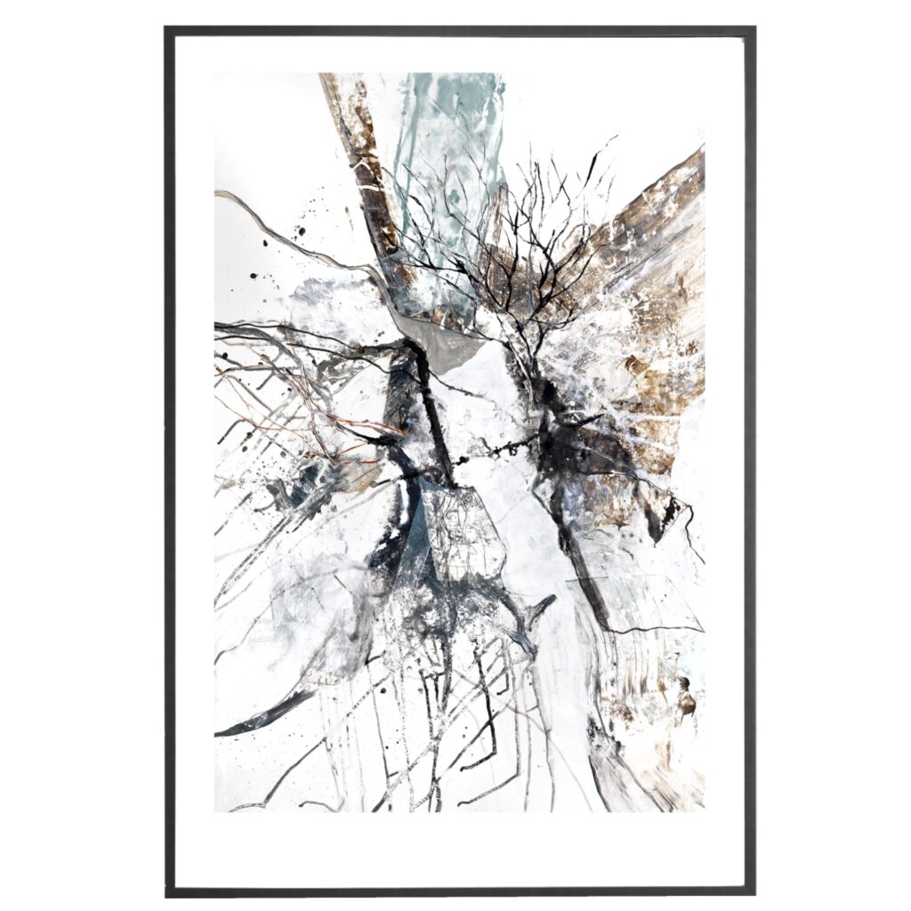 [0] => The Jossini Wall Art, on paper with a black frame, uses a minimalist color palette in shades of black, white, brown, and blue to create an abstract piece reminiscent of spindly branches reaching up to a pale winter sky. Jossini's neutral tones and contemporary look can complement a wide variety of design environments.