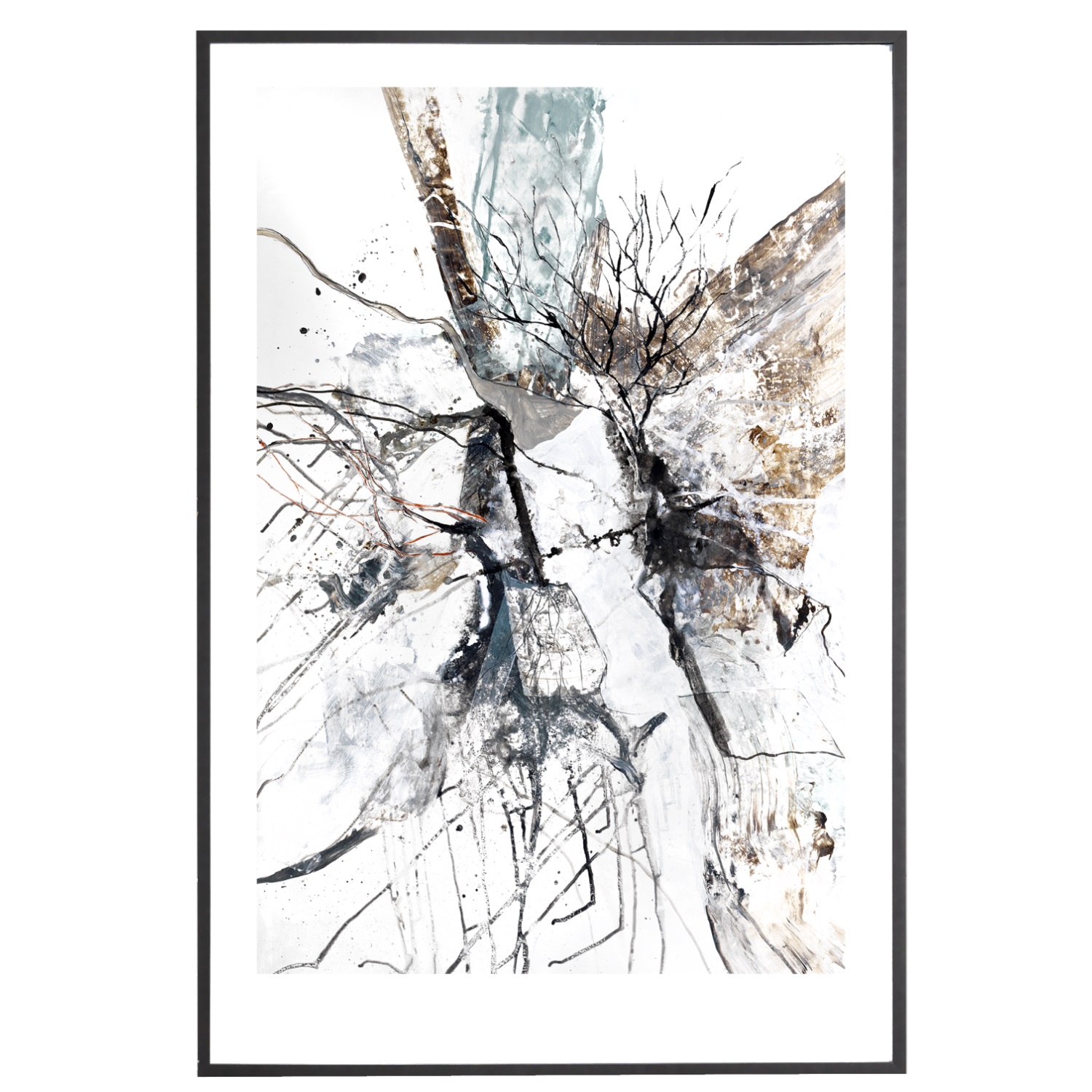 The Jossini Wall Art, on paper with a black frame, uses a minimalist color palette in shades of black, white, brown, and blue to create an abstract piece reminiscent of spindly branches reaching up to a pale winter sky. Jossini's neutral tones and contemporary look can complement a wide variety of design environments.
