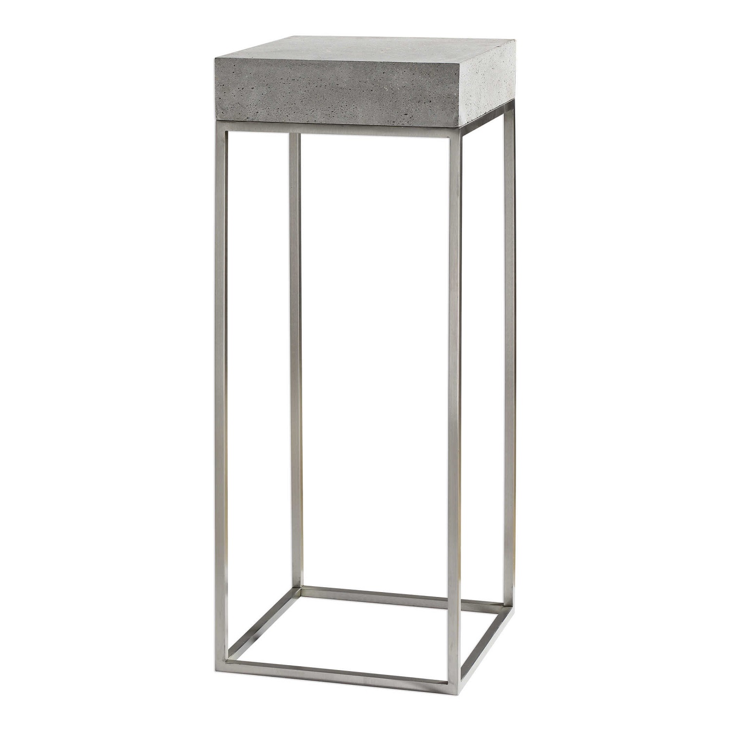 [0] => Add a touch of modern industrial design with the Jude Plant Stand. A solid handmade concrete top rests on a sleek steel base, creating a minimalist, structured piece that can complement any contemporary space or elevate a treasured plant. Natural variegations in the concrete leave a textured finish.