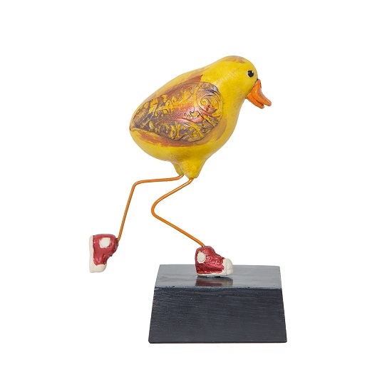 [0] => The Just Ducky sculpture, by artist Steven McGovney, has a cute and quirky personality, with a yellow body, red and white shoes, and a dynamic pose. Just Ducky is made of hand-built high-fire ceramic with acrylic, metallic, and oil stain finishes. Place it on your bookshelf, table, or credenza to instantly add charm to any room.
