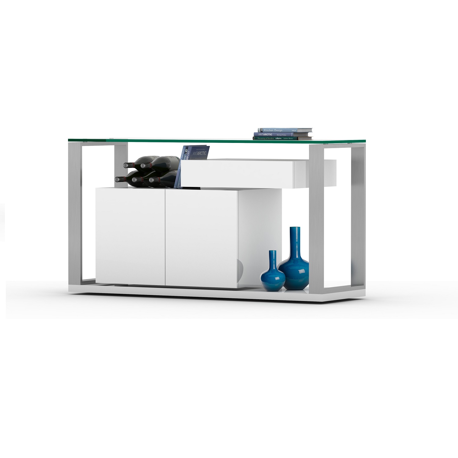[0] => The Karma Console features a contemporary asymmetrical design with two spacious cabinets and an off-center drawer unit that appears to float above. Available in a glossy white finish, this console has polished steel legs, a graceful glass top, and a long glass shelf inside its cabinet unit. Sleek and eye-catching, Karma is the ideal console for storage or display in your modern home.
