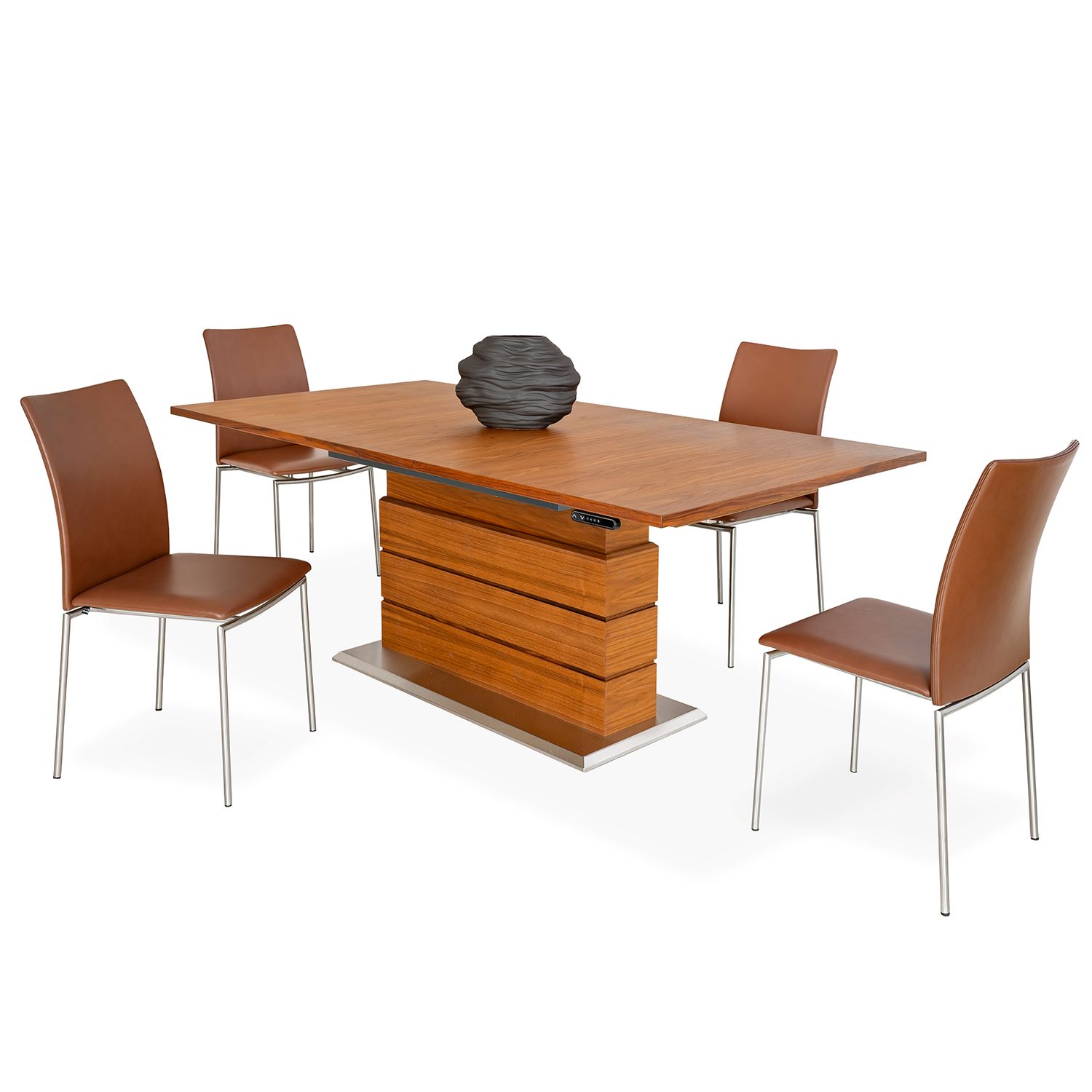The Karsten High Rise Dining Table features rich natural walnut wood, sophisticated design, and electric motion technology - all of which, when combined, make the Karsten a practical, savy choice for any dining room space. The electric height adjustment mechanism allows the tabletop to adjust from 25 ''- 43.'' In addition, the Karsten has two self-storage leaves.