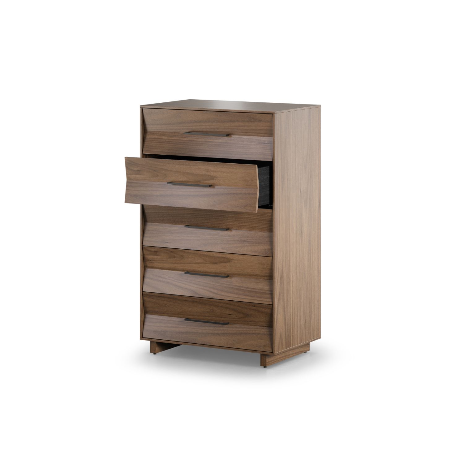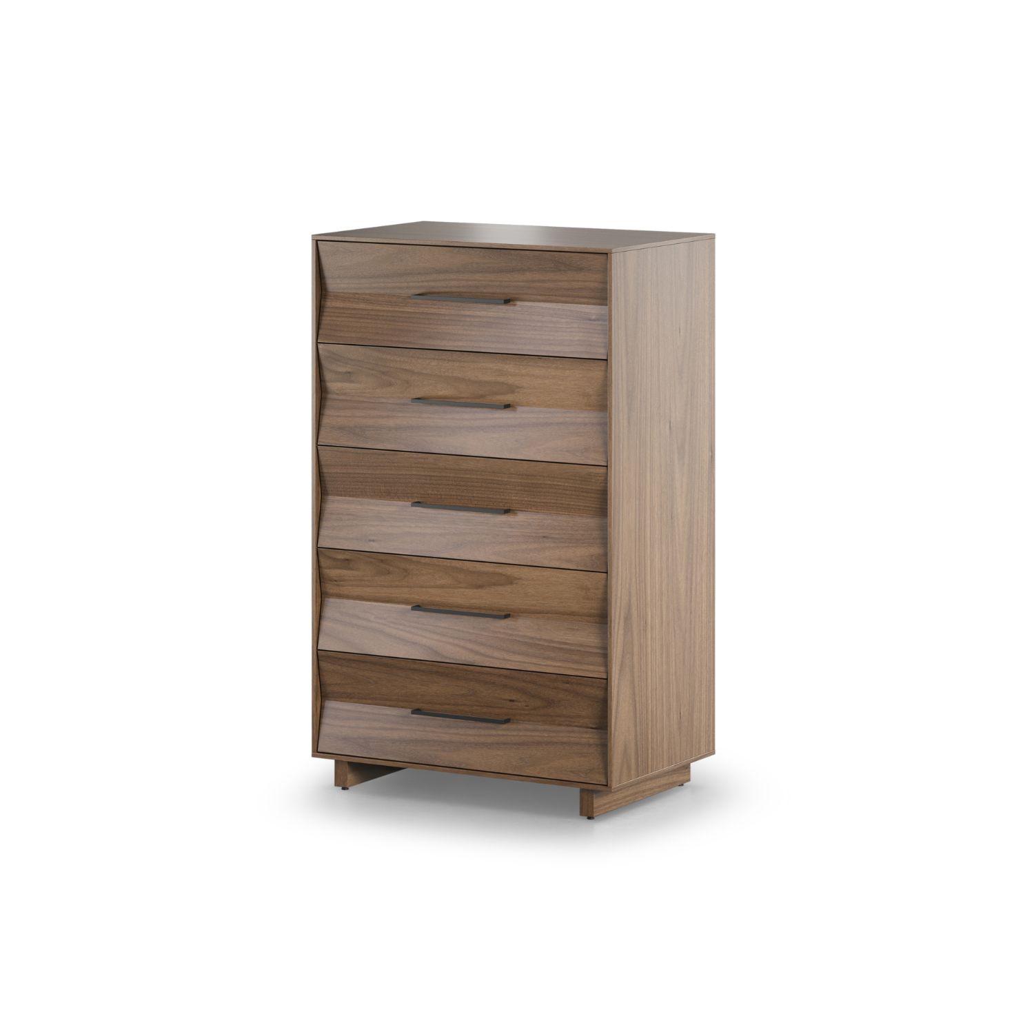 The Kava 5-Drawer Dresser makes a thoroughly modern statement with its sleek lines, crisp angles, and cutting-edge features. Designed by Matthew Weatherly and available with a walnut veneer, Kava features strikingly pleated drawer fronts that reveal precision engineering and an eye for style. Five spacious soft-close drawers offer ample room for your wardrobe, while a removable velvet-lined accessory tray streamlines organization. An interlocking mechanism allows only one drawer to be pulled out at a time, protecting young children from furniture tip-over. Wall anchor safety straps, floor levelers, and cable management wraps add additional layers of safety and functionality. With its bold look and thoughtful design, the Kava 5-Drawer Dresser pairs seamlessly with other Kava items for a beautifully streamlined home.