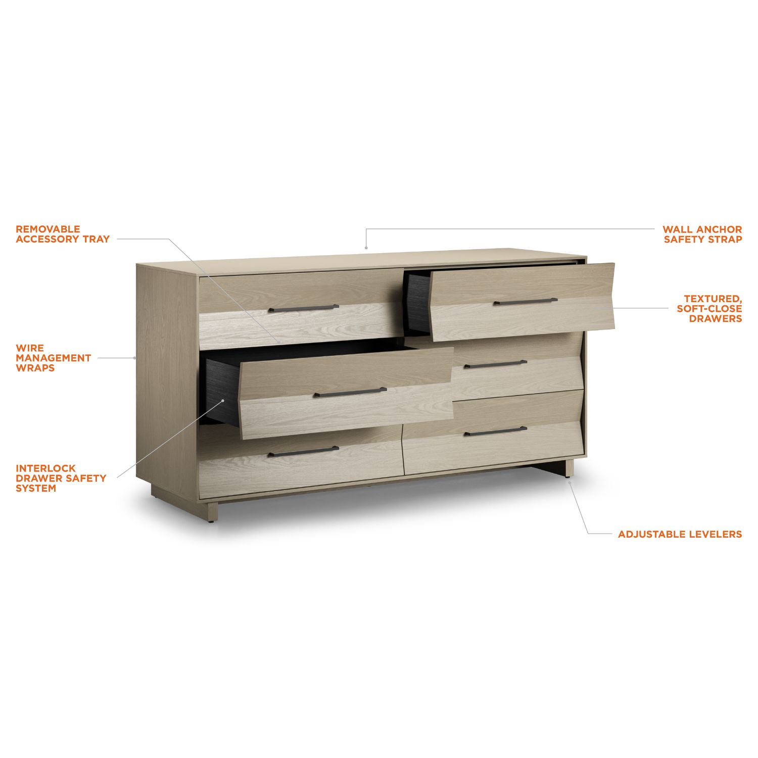 The Kava 6-Drawer Dresser makes a thoroughly modern statement with its sleek lines, crisp angles, and cutting-edge features. Designed by Matthew Weatherly and available with a washed oak veneer, Kava features strikingly pleated drawer fronts that reveal precision engineering and an eye for style. Six spacious soft-close drawers offer ample room for your wardrobe, while a removable velvet-lined accessory tray streamlines organization. An interlocking mechanism allows only one drawer on each side to be pulled out at a time, protecting young children from furniture tip-over. Wall anchor safety straps, floor levelers, and cable management wraps add additional layers of safety and functionality. With its bold look and thoughtful design, the Kava 6-Drawer Dresser pairs seamlessly with other Kava items for a beautifully streamlined home.