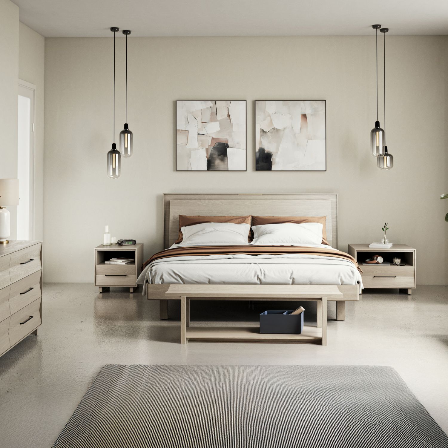 The Kava King Bed makes a thoroughly modern statement with its sleek lines, crisp angles, and cutting-edge features. Designed by Matthew Weatherly and available with a washed oak veneer, Kava has an angled headboard panel with dimmable LED lighting controlled via touchstrip. USB-C ports on each side of the headboard make it a breeze to charge devices while you yourself recharge.