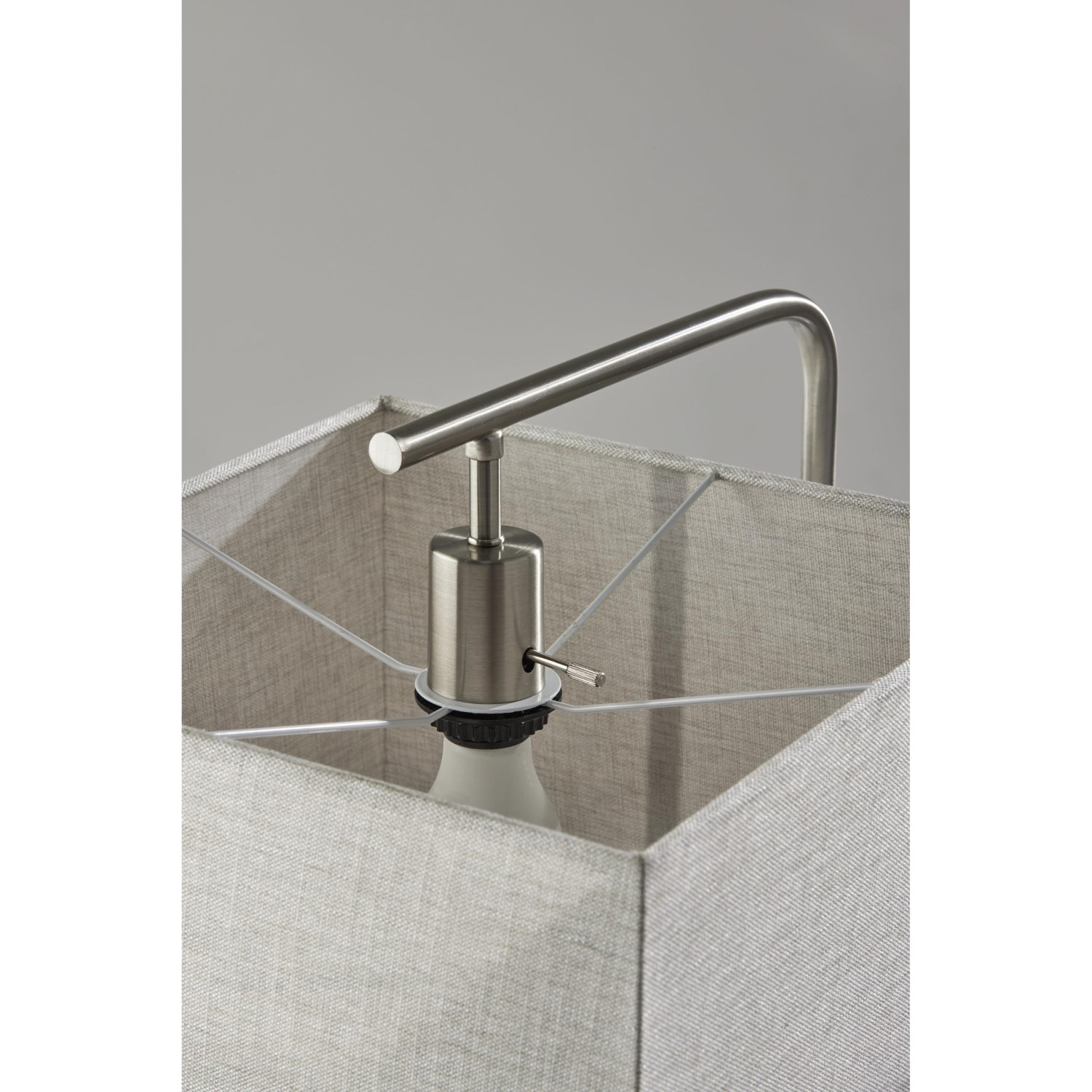 The Keegan Floor Lamp is a minimalist, modern lamp with a black metal and brushed steel base and stem and a square taupe fabric shade. The three-way rotary switch allows you to customize your light level and choose between low, medium, and high levels of light. Keegan's clean design and neutral palette makes it suitable for a wide variety of design environments.