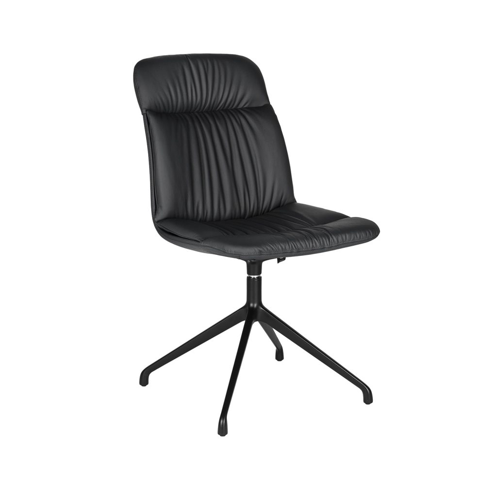 The Kelly dining chair, made in Italy, is the perfect complement to your dining or conference table. Kelly's embossed black metal swivel base allows you to move and turn easily, and its cushions are supportive and comfortable for the body. Kelly is upholstered in soft black leather.
