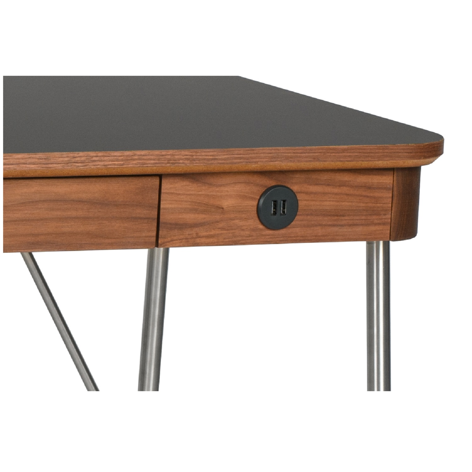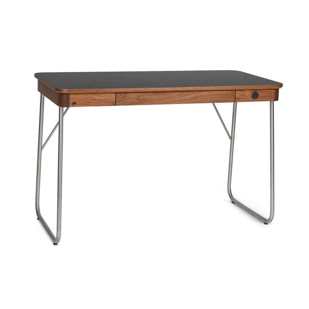 [0] => The Kenny Desk is a minimalist and functional desk, with built in USB and outlet plugs as well as discreet velcro straps to organize your electronic cords. A smooth Fenix nano top elegantly transitions into a natural walnut oil case, while the brushed steel legs curve in a unique flexible shape.