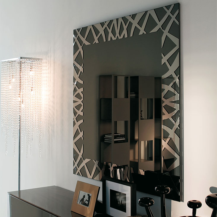 [0] => The Kenya Mirror, designed by Andrea Lucatello and made in Italy, makes a stunning statement in your bedroom, living space, or entryway. Kenya features smoked glass decorated along the borders with stainless steel accents. This mirror is contemporary and artistic and will bring dimension to any space.