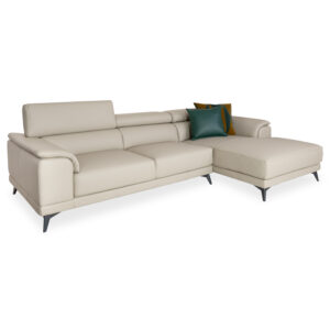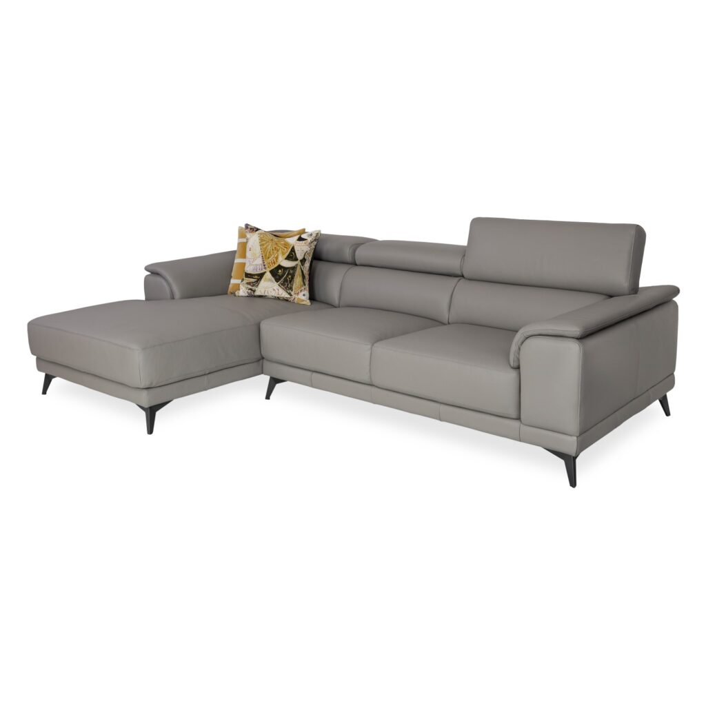 The Kinsley Sectional features smoky grey leather, black metal legs, and a structured, contemporary design. Three manually adjustable headrests allow you to customize your comfort, while the cushioned seats and armrests welcome you to sit back and relax. Straight seams with matching stitching along the side panels and chaise give this sectional a tailored look, and the triangular legs add a subtle geometric touch. The Kinsley Sectional's clean, inviting design is sure to bring comfort and relaxation to any living space.