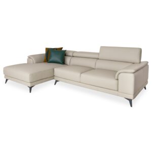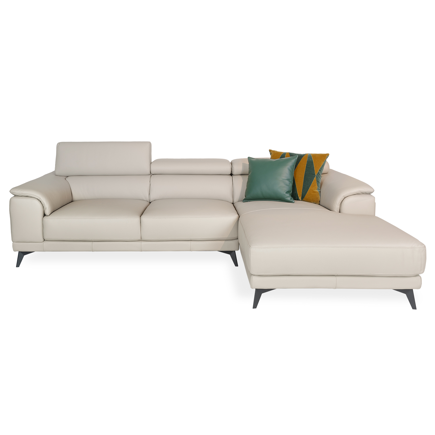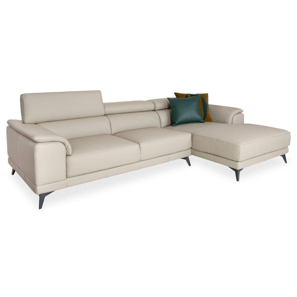 The Kinsley Sectional features light mocha leather, black metal legs, and a structured, contemporary design. Three manually adjustable headrests allow you to customize your comfort, while the cushioned seats and armrests welcome you to sit back and relax. Straight seams with matching stitching along the side panels and chaise give this sectional a tailored look, and the triangular legs add a subtle geometric touch. The Kinsley Sectional's clean, inviting design is sure to bring comfort and relaxation to any living space.