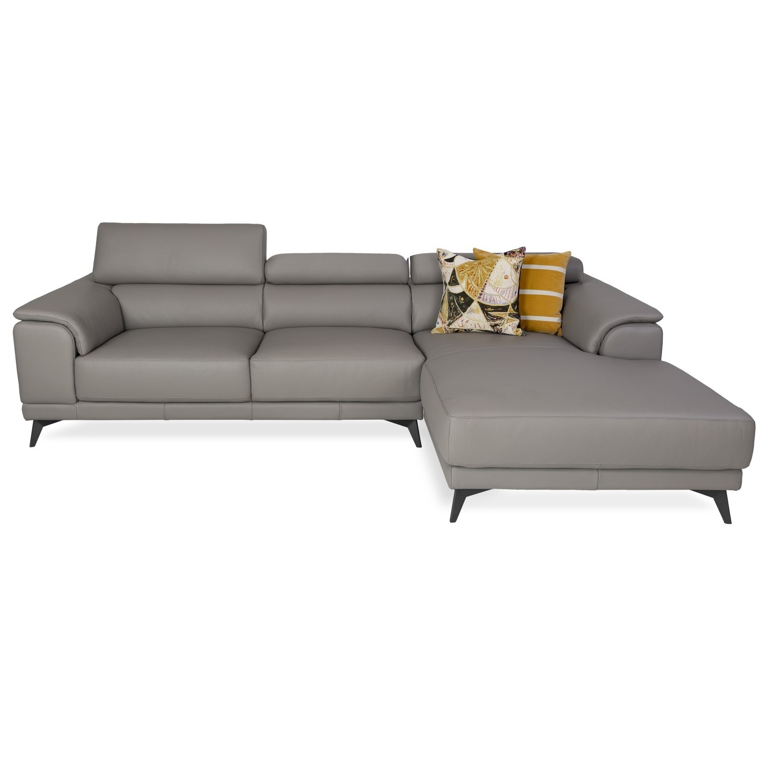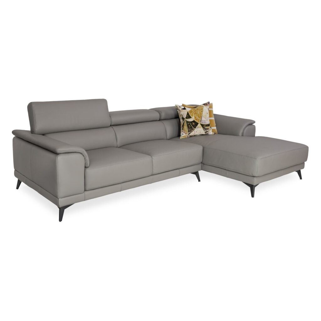 The Kinsley Sectional features smoky grey leather, black metal legs, and a structured, contemporary design. Three manually adjustable headrests allow you to customize your comfort, while the cushioned seats and armrests welcome you to sit back and relax. Straight seams with matching stitching along the side panels and chaise give this sectional a tailored look, and the triangular legs add a subtle geometric touch. The Kinsley Sectional's clean, inviting design is sure to bring comfort and relaxation to any living space.