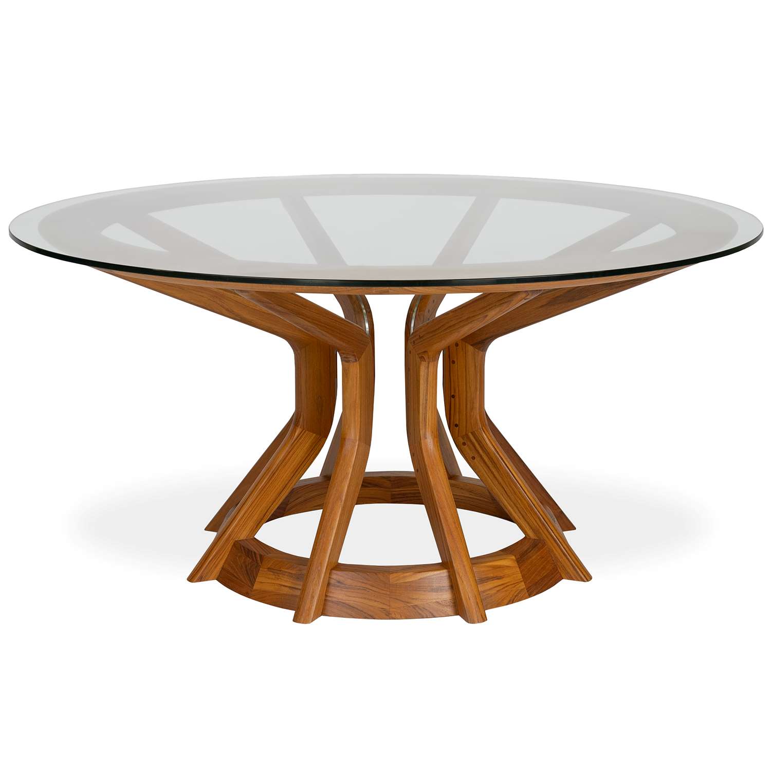 Crafted from teak wood, the Klaus Round Dining Table melds traditional and modern design influences to create a bold impression. Klaus' clear glass tabletop puts the craftsmanship of the wooden base on full display, with eight angled segments arranged in a wheel-like formation and anchored by circular rings on the top and bottom. Sure to be a conversation piece, Klaus can seat up to 8 diners for every occasion from casual meals to formal dinners.