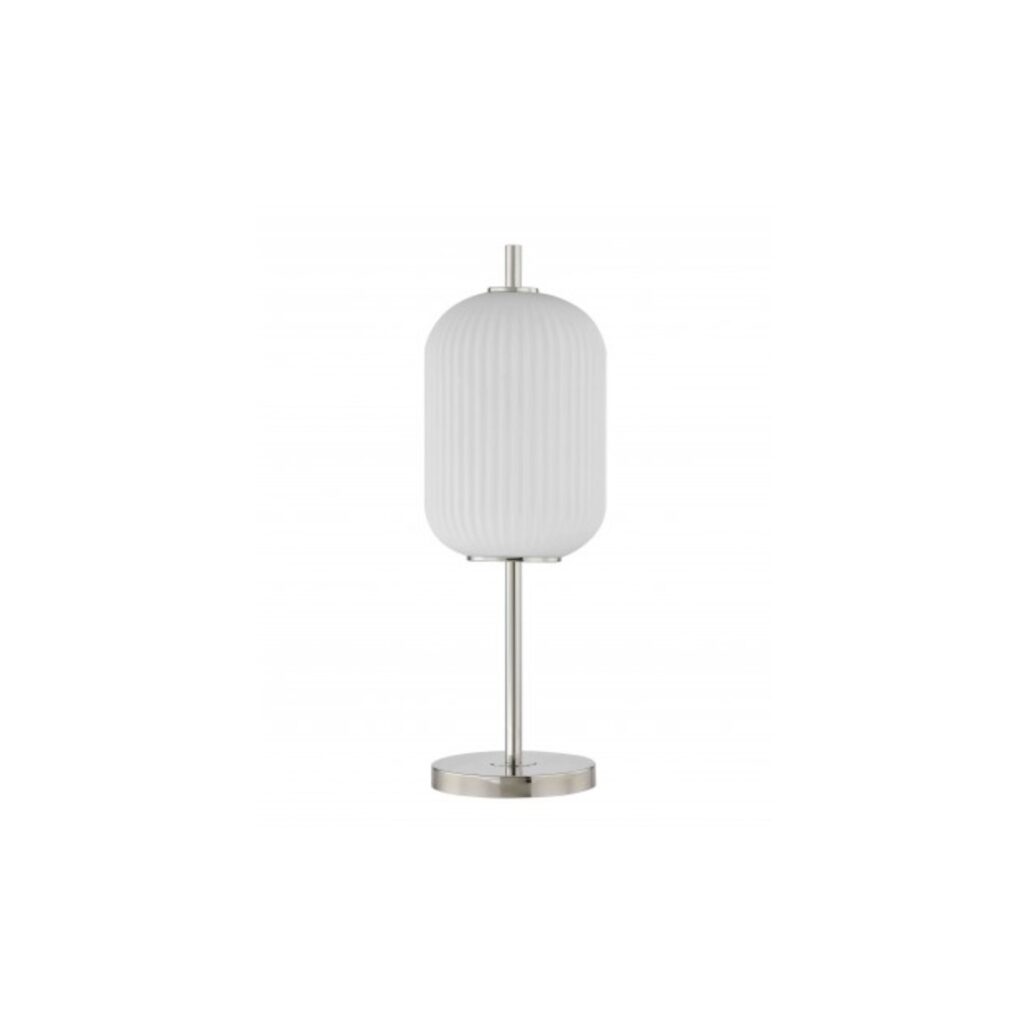 [0] => The Kyler Table Lamp features a frosted white glass shade with a pleated, cylindrical form and a base made of metal with a bright nickel finish. A 4-way touch switch lets you customize the brightness of the LED light, whether you are reading, working, entertaining, or relaxing. Kyler's light color scheme complements a variety of interiors, while its modern silhouette makes it a pleasing accent piece.
