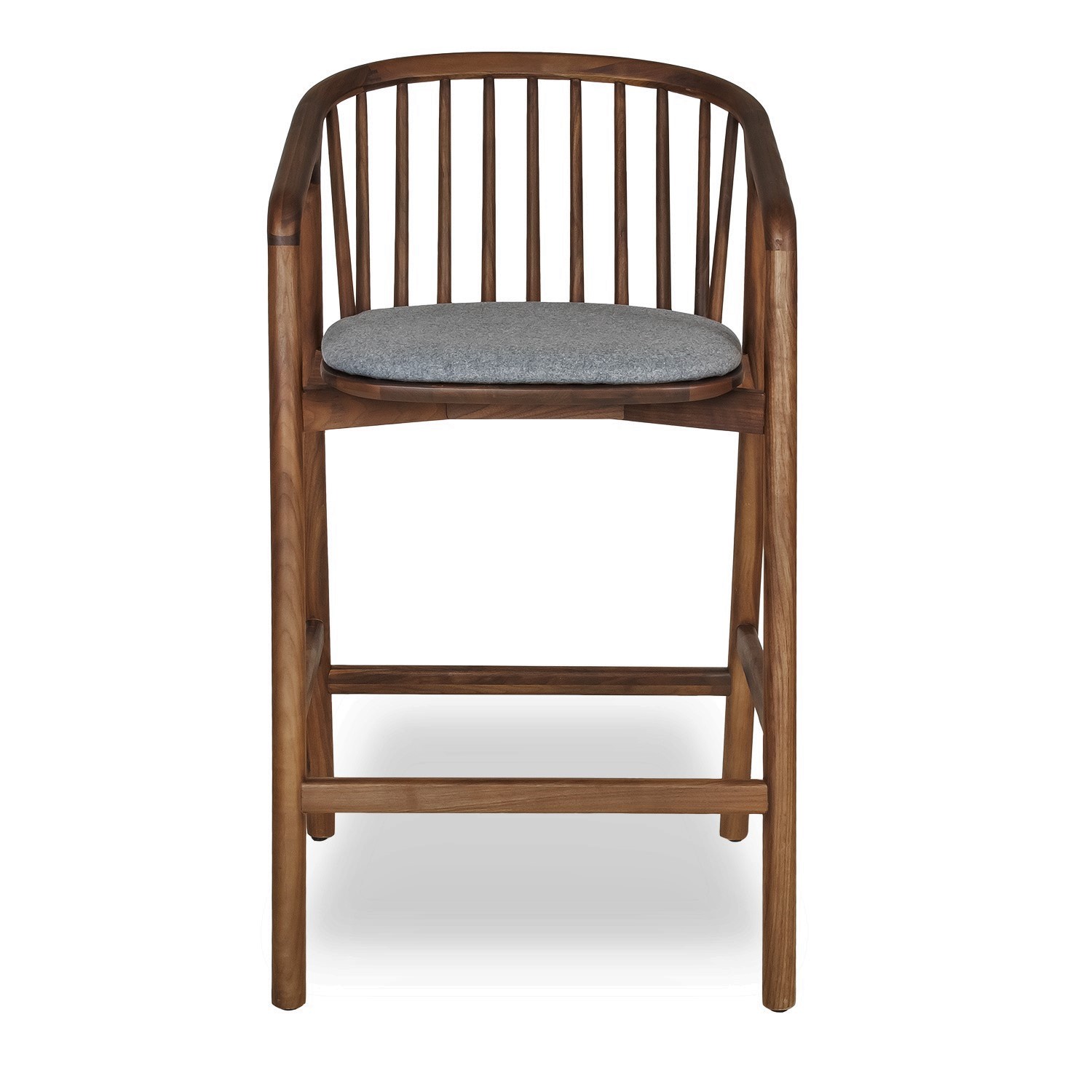 A timeless design with a contemporary twist, the Lake Counter Stool features smooth, high-quality craftmanship and warm walnut wood that bring a graceful, modern look. Lake's solid walnut frame has a rounded slat back, framed by curved wood that seamlessly flows into the front and back legs. The spacious seat, padded with a removable grey fabric cushion, creates a welcoming, homey feel. Lake's mid-century modern design and graceful look make it an instant classic that doesn't sacrifice comfort and support.