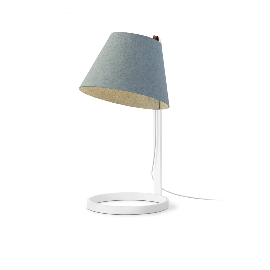 [0] => The Lana Large Table Lamp is designed to fit right into any space. This lamp includes a unique magnetic shade that is easily adjustable with a discreet leather handle located on the back. Available with a white base and subtle blue shade, this lamp is versatile and features a circular base that parallels the cylindrical structure of the shade.