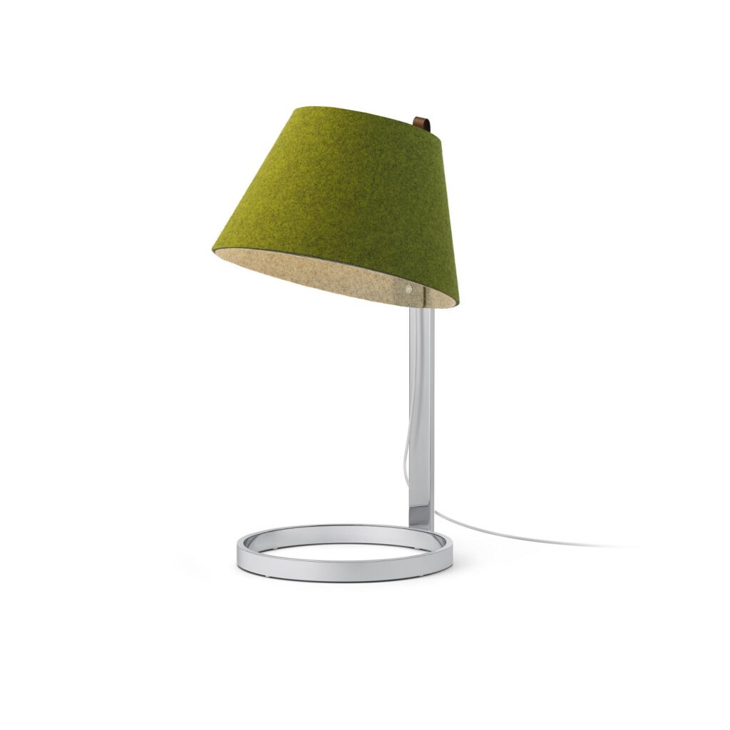 [0] => The Lana Small Table Lamp is designed to fit right into any space. This lamp includes a unique magnetic shade that is easily adjustable with a discreet leather handle located on the back. Available with a chrome base and vibrant moss shade, this lamp is versatile and features a circular base that parallels the cylindrical structure of the shade.