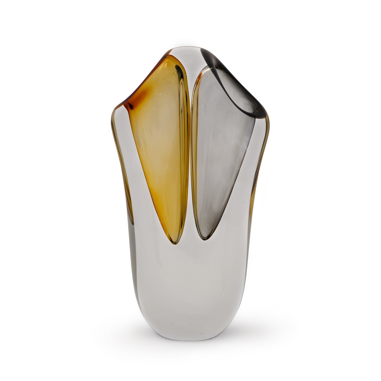 The Large Duet Vase features mouth blown art glass in a combination of amber and grey. Its unique curved shape allows it to have two compartments for flowers, or to be used on its own as an art piece, with the amber and grey creating watercolor-like accents.