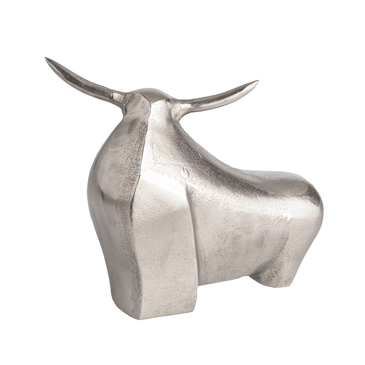 [0] => The large Freeplay sculpture, crafted from raw nickel and aluminum, portrays the figure of a proud, strong bull with broad horns using a touch of abstraction.