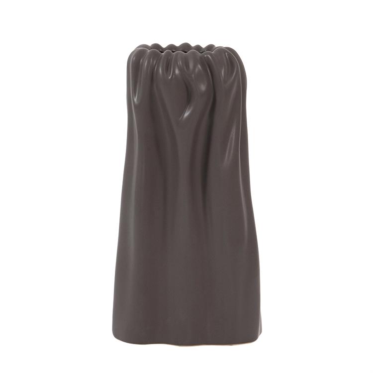 [0] => The large Gathered ceramic vase, available in graphite, is a tall vase that appears to have thick, gathered fabric around the rim. The vase is elegant and stately and complements a variety of design environments.