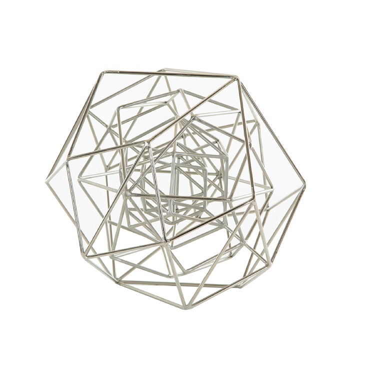 [0] => The Large Geo Sculpture has a nickel finish and is inspired by shapes found in science and nature. Its layered angular look is contemporary and minimalist, making it easy to integrate into a wide variety of spaces. Place the Geo Sculpture on your table, credenza, or bookshelf by itself or in combination with the Geo Sculptures in other sizes.