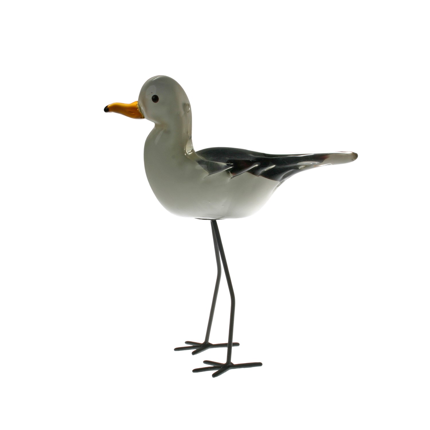 [0] => The Large Seagull with Metal Legs has a grey and white body with feather lines, a curved orange beak, and black legs bent at a slight angle. The colors within the glass create delicate textures that complement the smooth, sleek form. Ideal for a coastal-inspired interior or as a gift for any lover of birds or marine life.