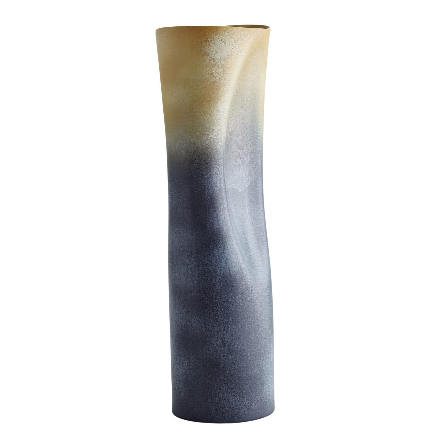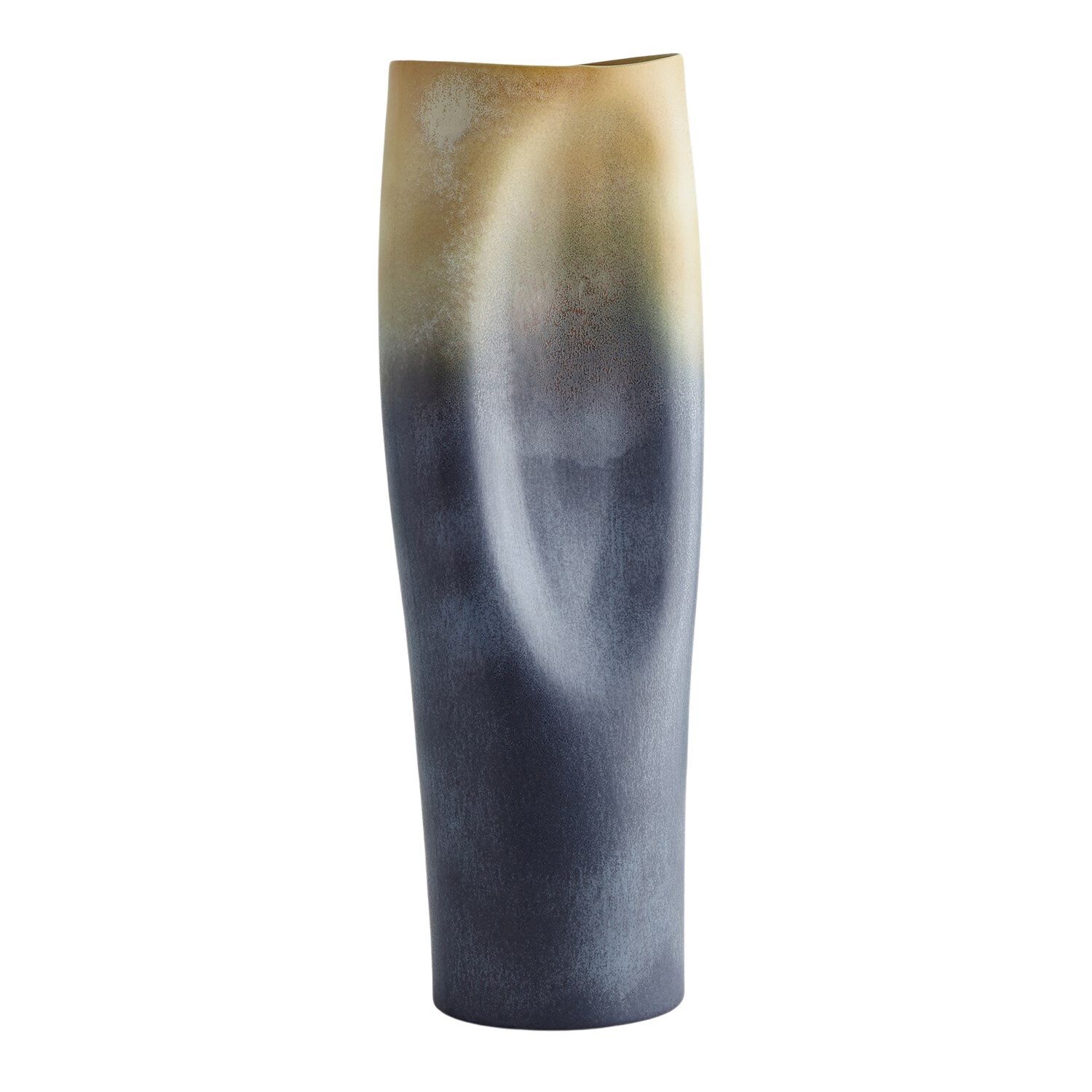 Made of Portuguese slip-cast ceramic, the Large Indent Vase features a cheerful blue and yellow color scheme with two striking indentations on its front and back. This vase also has an overglaze color effect, which means pigments are applied after the initial firing and fired again at a lower temperature for greater vibrancy and durability. Display your favorite fresh or artificial flowers in this watertight vase for a one-of-a-kind style accent.