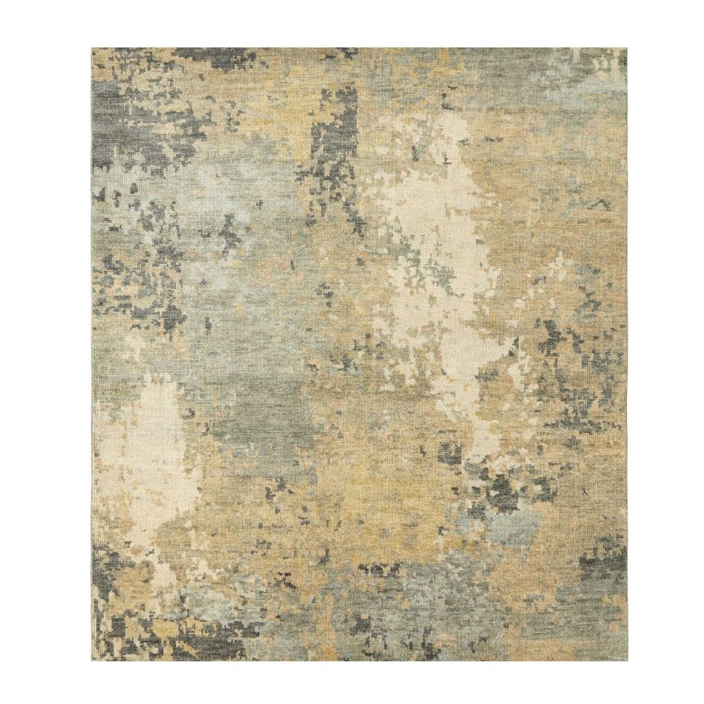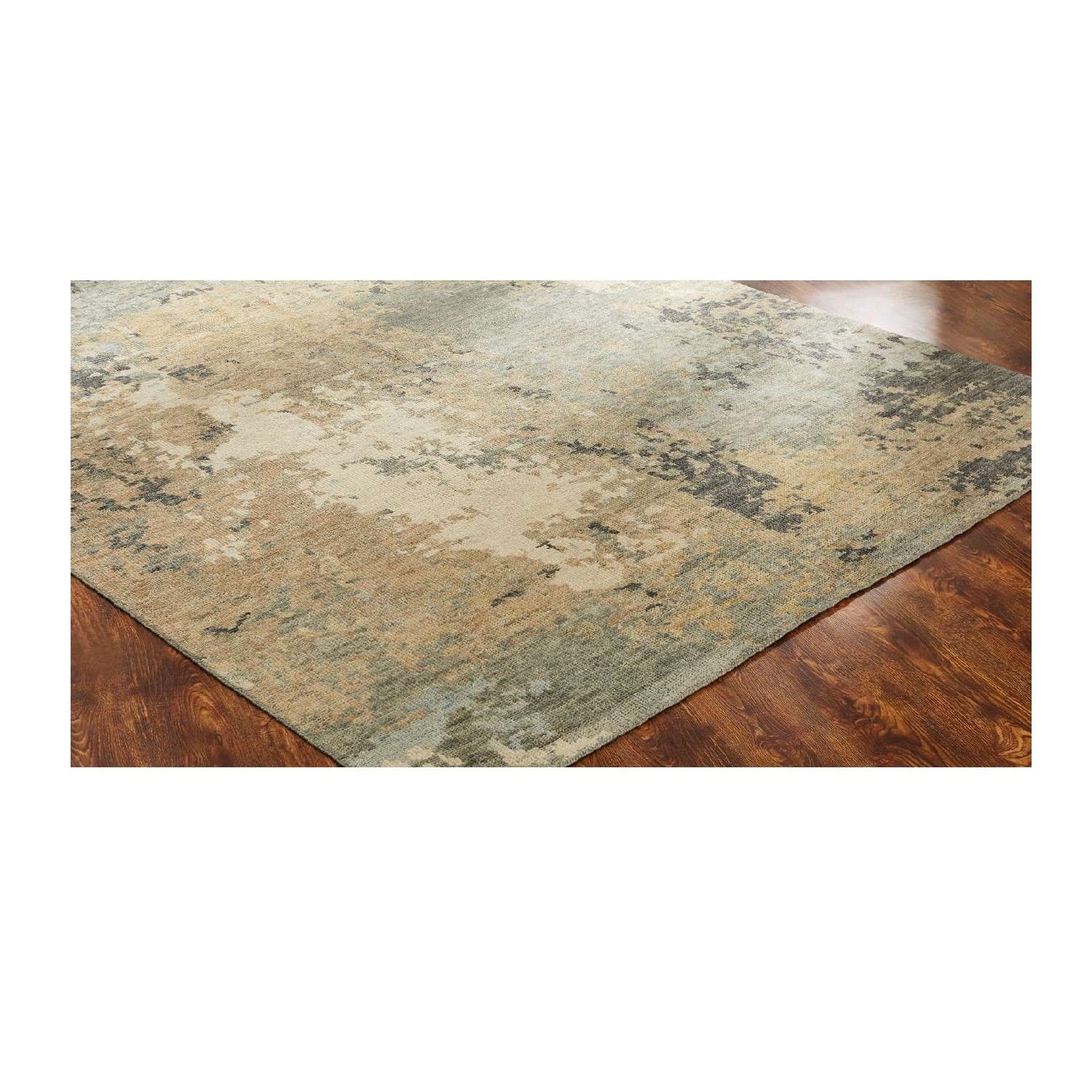 Add a multicolored accent and a touch of warmth to your floor with the large Infinity Rug, shown here in a Granite Sands design. This rug is hand-spun and hand-knotted from 100% wool, giving it a cozy, textured surface. Patches of yellow and beige, as well as muted green and blue, create an abstract, fragmented look that evokes woodland or desert landscapes.