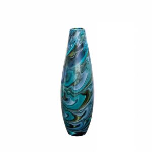 [0] => The Large Prismatic Vase features a gradient design in a combination of blue, green, grey, and gold. The splash-like accents of color create a wave-like appearance that is further enhanced by the rounded structure. A unique piece of art that is perfect for display on any tabletop.