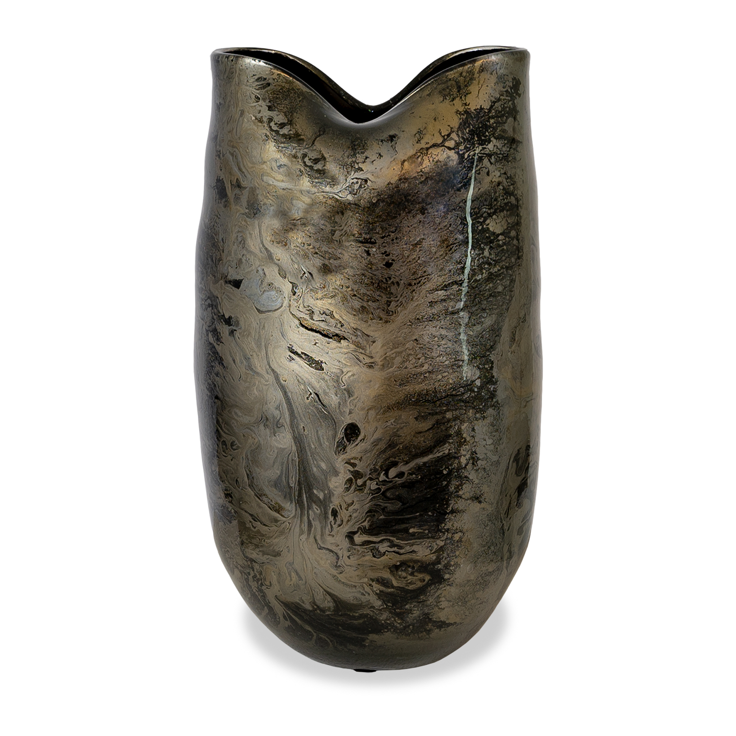 [0] => The Large Urn features a marbled pattern in shades of muted gold and grey that evoke the look of flowing silt in a riverbed. Its organic cylindrical shape is accented by two gentle indentations on opposite sides of its mouth for a unique silhouette. Fill the Large Urn with flowers or display on its own as an art object that embodies elegance in pattern and form.