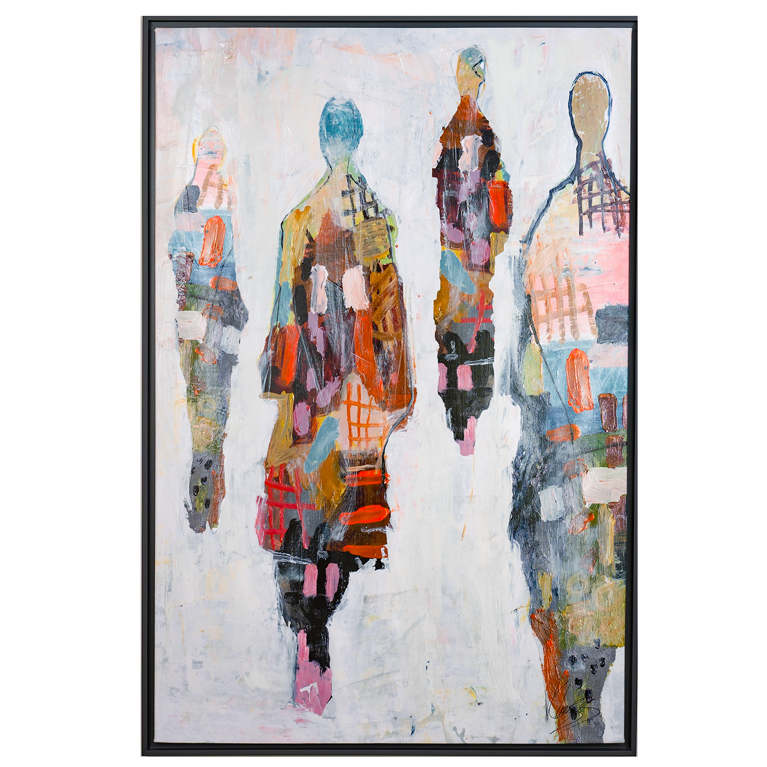 Laviano II is a contemporary wall art depicting four colorful figures on an off-white background. The outlines of the standing figures are filled in with an abstract, collage-like blend of brushstrokes and visual textures in colors ranging from rich earth tones to pale pastels. Sophisticated and stylish, Laviano II comes with a grey frame and is sure to become a conversation piece in your home.