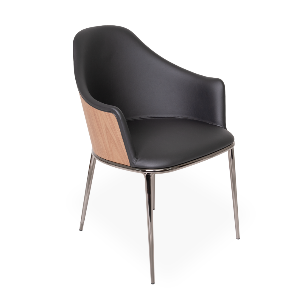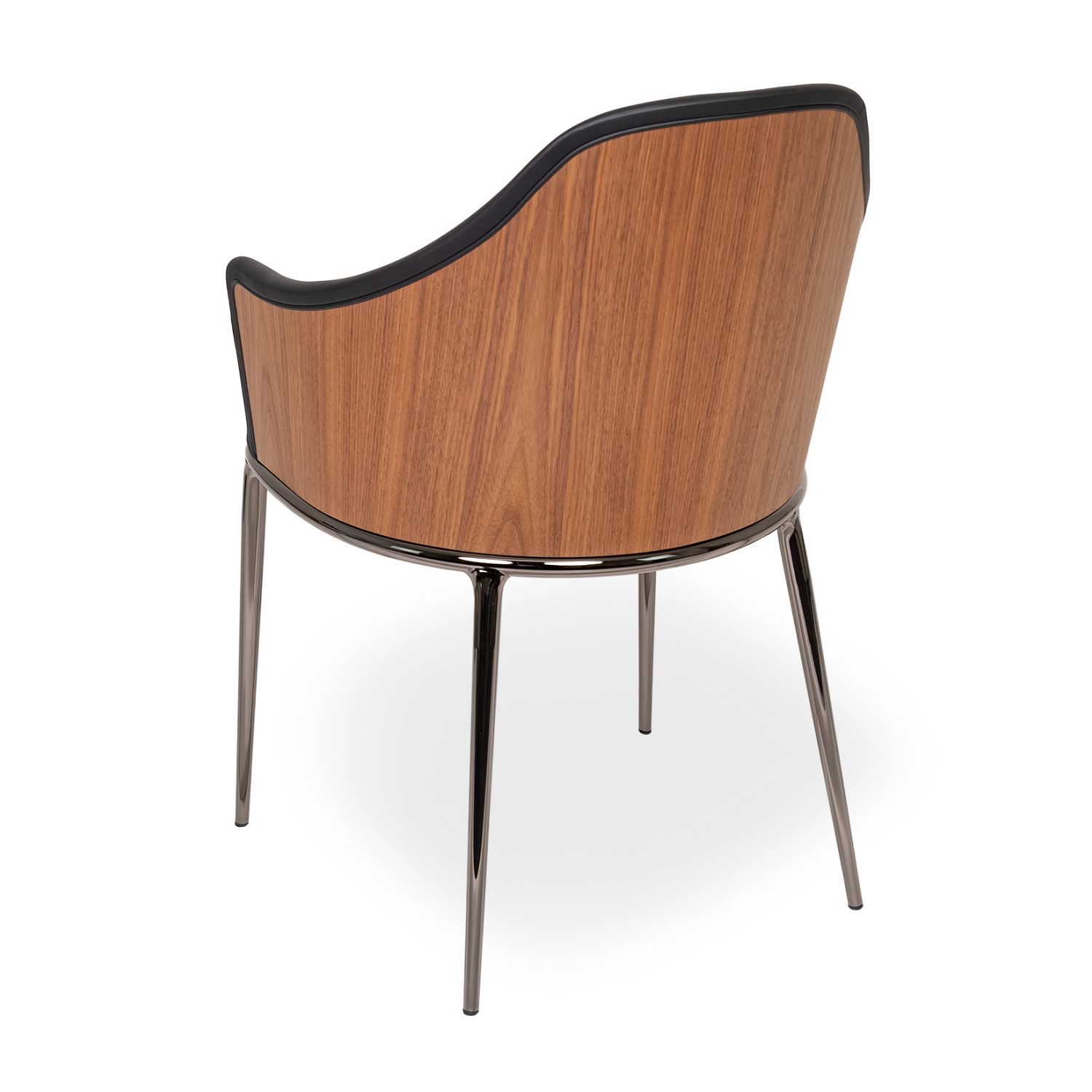 [0] => The Lea Armchair is contemporary and sleek with upholstery in black similpelle artificial leather with matching stitching, a back in flamed walnut lacquered veneer wood finish, and legs in black nickel. Made in Italy, Lea's high quality craftmanship and materials ensure long-lasting comfort. The subtly curved lines of the seat back and armrests and the minimalist color palette allow Lea to fit into any design environment.